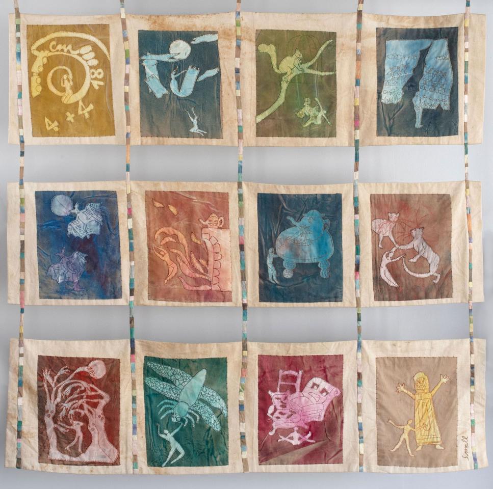 Broderie, appliqués de fil d’or, de ficelle, de dentelle et/ou de tissus (lin, coton, coton ajouré, soie), texte peint sur lin et coton, 23 x 29 cm à 32 x 41 cm.