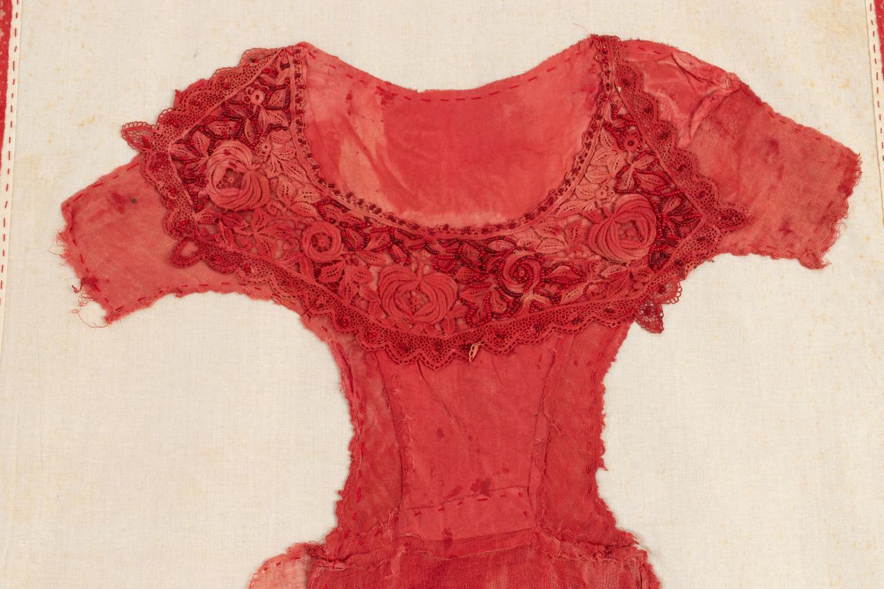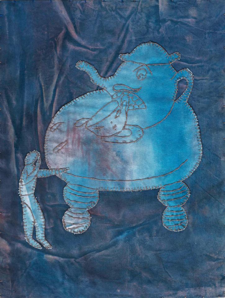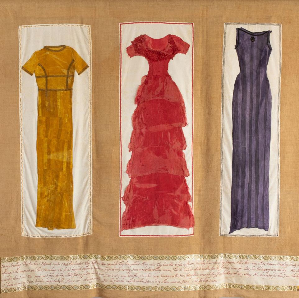 Térésa Small nous emmène tout au bout de sa case auprès d’Éternité (2006), l’une de ses premières œuvres, qui trône sur le très grand lit d’une chambre inoccupée. Par « premières œuvres », elle désigne celles qui opèrent un passage entre son activité de costumière de théâtre et sa pratique d’artiste. Costumière : c’est sous cette identité qu’elle est arrivée à La Réunion en 1988, pour peu à peu l’abandonner – troupe, mari, vie de famille avec –, et pour s’installer définitivement dans l’île ; ce passage d’un art dit « appliqué » à un art qu’on dirait moins appliqué n’est pas, lui, une rupture, mais bien plus une longue transition faite d’allers-retours. Sur un large tissu de lin naturel sont cousues trois robes : une jaune, une rouge, une violette. Chacune est appliquée au centre d’un rectangle de tissu blanc et cernée d’une frise ornementale dessinée par de simples coutures brodées. Les robes, toutes rapiécées, sont exagérément étirées et n’offrent aucune ouverture ; elles dessinent les pâles contours de corps allongés, flottants, corps fantômes. Entre elles, des parures : chaussons avec des traînes, collerette et mitaines, tout un équipement pour des marches nocturnes hallucinées, empêchées par des accessoires inadaptés. Dans une sorte de long cartouche au bas de cette composition, un texte est peint en lettres obliques et rouges : « […] They shall ever live immortal. They have gathered all my riches. They have bled to feed my flowers […]. » Ce texte de Béla Balázs est un extrait du livret du Château de Barbe-Bleue de Béla Bartók. On comprend alors que ces formes définitivement aplaties, aux couleurs passées, tenues comme par des points de suture, sont les silhouettes de ces femmes assassinées de la main de leur mari, ce tueur en série. Pour elles, c’était « le soleil qui poudroie et l’herbe qui verdoie » sans sauveur, sans issue. D’elles, il ne reste que leur sang pour tracer ces lignes, pour nourrir les fleurs, pour teindre les tissus. Car Térésa Small fabrique tout de ses mains, avec des matériaux qu’elle glane sur place et qu’elle a accumulés au fil de sa vie. Elle fait et défait les coutures au gré des besoins, aucune couture ni aucun lien n’est définitif ; une ancienne robe de famille peut prêter un bout de sa broderie à une autre composition et rester accrochée au bas de la jupe, effilochée comme un ornement fragile, témoin d’un passé suspendu. Térésa Small découpe et délave des tissus grattés, rapiécés, désossés, augmentés, pour les plonger dans plusieurs bains de plantes tinctoriales, de fleurs, de jus de légumes, de graines, de sels fixateurs. Dans un mouvement similaire qui consiste à faire et à défaire selon les besoins, Éternité, cette large toile étendue à l’horizontale, est tout autant une peinture qu’un couvre-lit. Elle remplit en effet très bien cette double fonction : elle couvre un lit inhabité, entièrement dédié au repos des femmes-fantômes, et laisse un goût assez viscéral imprimé dans la rétine. Voilà pour cette pièce du fond.