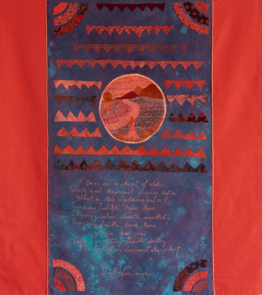 Dans la seconde, un autre couvre-lit, ou plutôt, une autre toile sur tissus, repose à l’horizontale sur un plus petit lit : Le Lac des larmes (2000). Des bribes de plusieurs tissus s’agencent dans une symétrie de tons sourds, bleus et rouges. Elles dessinent un médaillon flottant au milieu de vagues stylisées, pris dans une large bordure symétrique. Dans la partie basse de l’œuvre, une écriture brodée continue l’histoire des femmes de Barbe-Bleue. Cette fois, il s’agit de Judith, la dernière femme, celle qui a ouvert toutes les portes jusqu’à la septième. Elle sait, elle a vu, le meurtre de celles qui l’ont précédée. Et elle garde pour son bourreau des mots doux comme pour se maintenir encore un peu au seuil de sa mort :