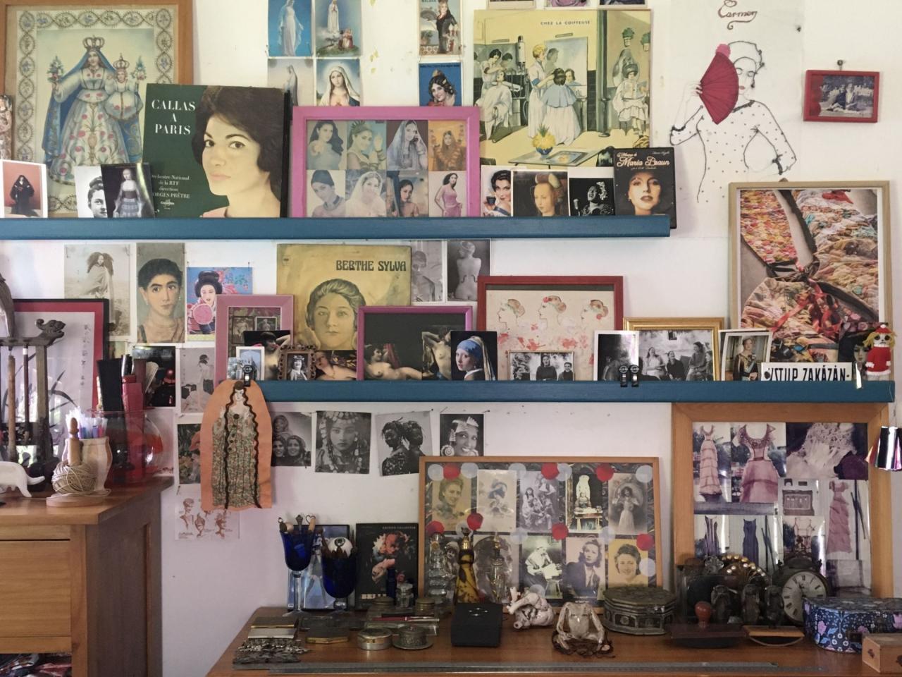 Pour arriver chez Térésa Small, on a pris la N3 qui passe par l’intérieur de l’île de La Réunion pour la traverser du Sud au Nord, c’est-à-dire qu’on est parties du niveau de la mer pour le retrouver de l’autre côté en passant par des hauteurs1 . Cette route est plus sinueuse, plus longue, plus belle aussi. Installée à l’arrière, j’observe les yeux mi-clos le soleil se lever sur ce paysage de crêtes et de ravines tapissé d’une forêt de fanjans si dense qu’elle semble, en fait, tout à fait confortable. Bercée par les sons de Sibu Manaï et d’Alain Péters, ma trouille viscérale de la voiture finit par me lâcher. À la sortie d’un virage, on aperçoit la mer sombre, profonde. Tout en bas, à Rivière du Mât les Hauts, Térésa Small nous a servi un bissap sur la terrasse de sa maison basse, tout en lambris peint, rose et bleu comme un drapeau. À l’intérieur aussi, le bicolore se décline dans chaque pièce, rendant lisible la structure porteuse de ce qu’elle appelle « ma case-atelier ». À l’image de cette trame colorée, l’organisation des espaces est très claire. Seule la grande pièce principale est entièrement tapissée de livres, boîtes d’archives, boîtes à couture, boutons, bobines de fil, rubans, rouleaux de tissu, avec, comme des pauses dans ce délire de couleurs éclatantes, des photographies noir et blanc, sépia, des cartes postales de peintures, des photographies anciennes ou découpées dans des magazines, figures détourées, épinglées, accolées, superposées. Dans mon souvenir, toutes sont des portraits de femmes qui semblent se regarder, se toucher, discuter entre elles. On dirait même qu’elles se sont tues lorsqu’on a franchi la porte.