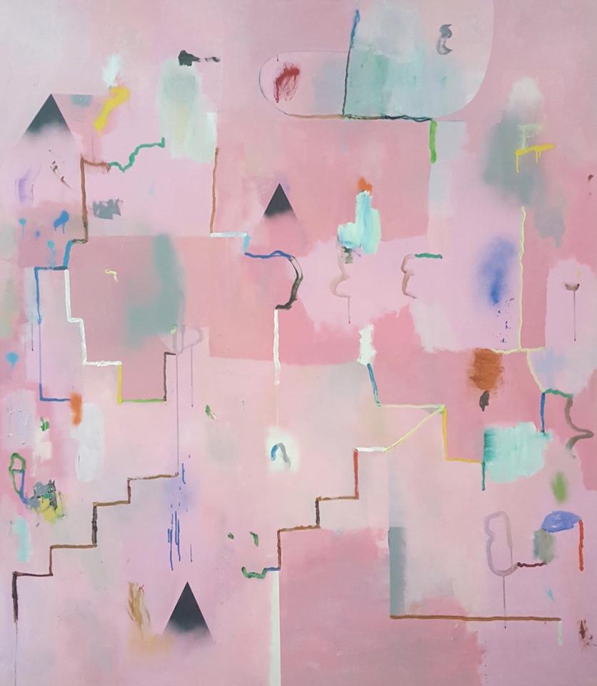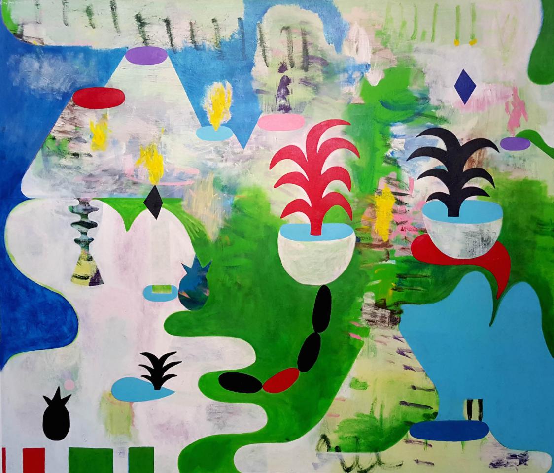 Se référant aussi bien aux codes de la figuration qu’à ceux de l’abstraction, ses tableaux se composent peu à peu en plateaux et échappent aux principes de la perspective, en assumant les « formes plates » et le traitement de la profondeur par la couleur et les textures. Avec les séries Plateformes (2013-2014) puis Archipel Vertical (2014-2016), l’artiste introduit l’idée d’archipel à son champ de recherche et aborde peu à peu le paysage comme une sorte de cartographie sensible. La peinture devient pour lui un espace intermédiaire : « Le processus pour arriver au paysage est indissociable du paysage lui-même », dit-il, rendant lisible en surface le cheminement du geste et de la pensée comme la quête d’un point d’équilibre. L’œil navigue alors entre l’espace physique de la toile et celui que suggère le paysage, au sein duquel les figures apparaissent comme en suspens.