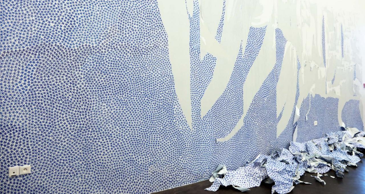 La fleur bleue, elle, motif presque naïf incarnant ce temps de latence, continue sa propagation lente sur les murs, le papier, les tissus ou les peaux, jusqu’à s’infiltrer dans l’air d’une chanson que l’on fredonne en secret. Étude pour une chanson d’amour compressée (OHOUI, performance, 2013), chanson d’amour sans mélodie, balbutiements et corps vibrant comme une litanie, aveux d’amours et d’échecs se profilent dans les images du boxeur vaincu (RUSSEL AVRIL, 5 DÉFAITES, 1 NUL, 4 KO, photographies, 2013) ou du « crooner désœuvré ».