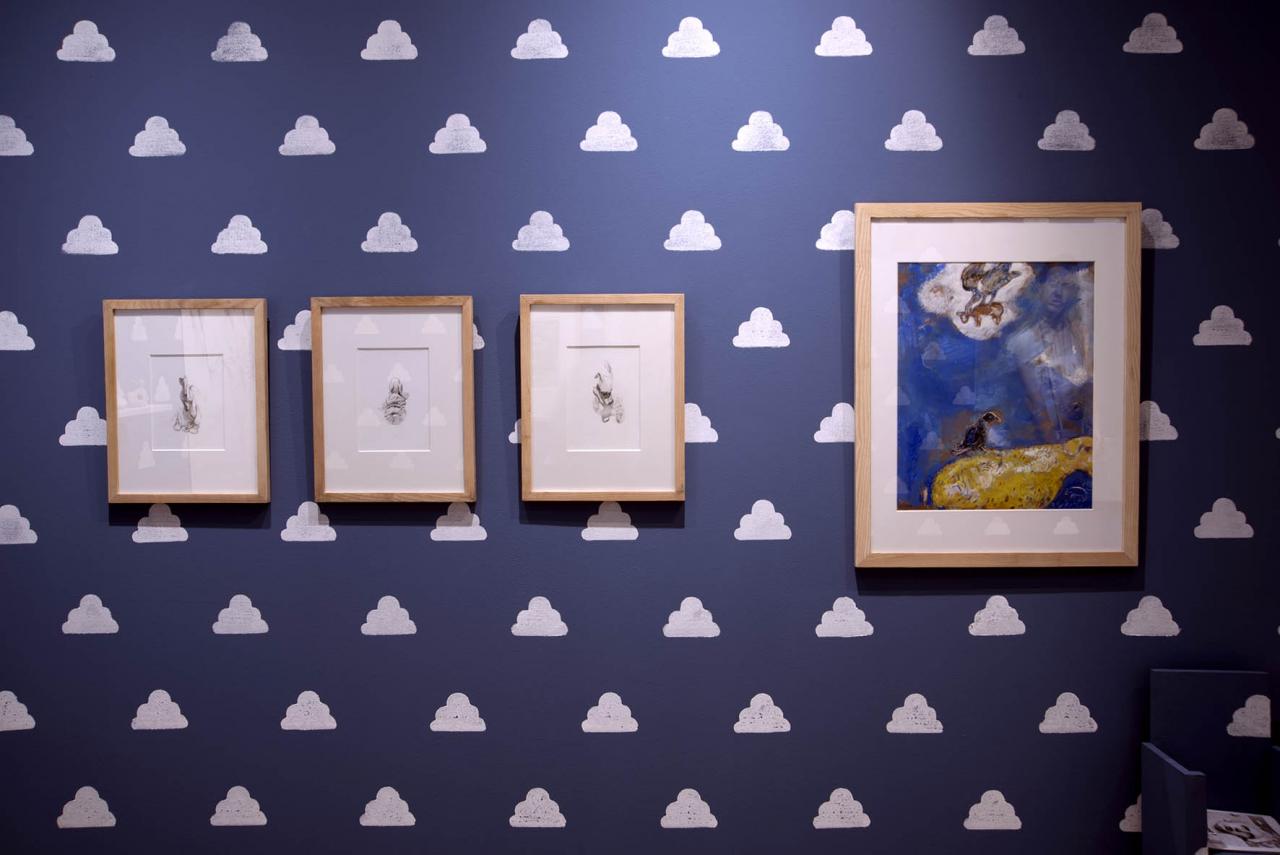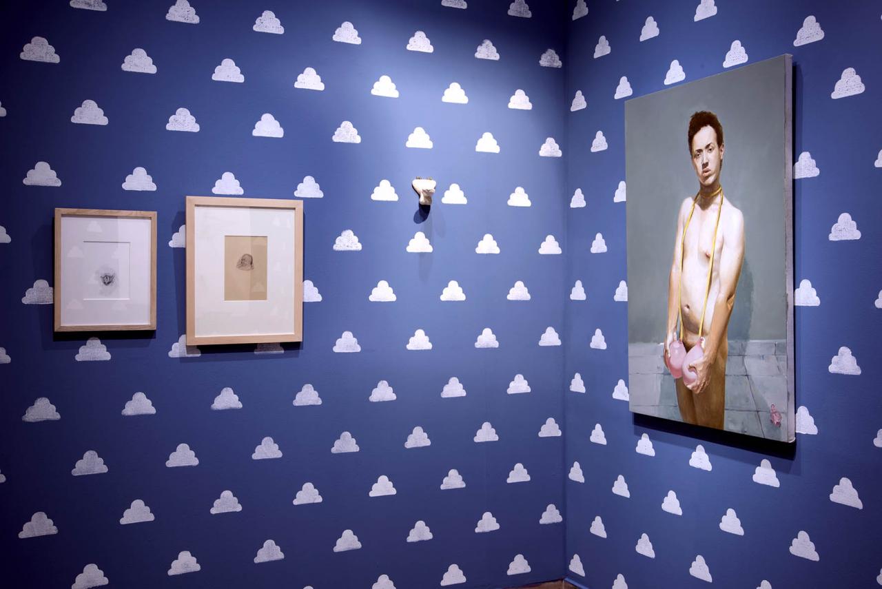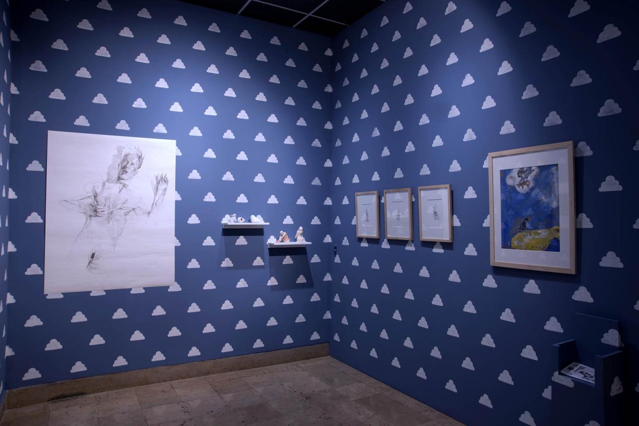 La couleur bleue et les nuages sont une évocation de la « Chambre bleue », le « décor » mental, l’arrière-plan, le contenant virtuel de beaucoup de mes œuvres : murs bleus, petits nuages blancs…