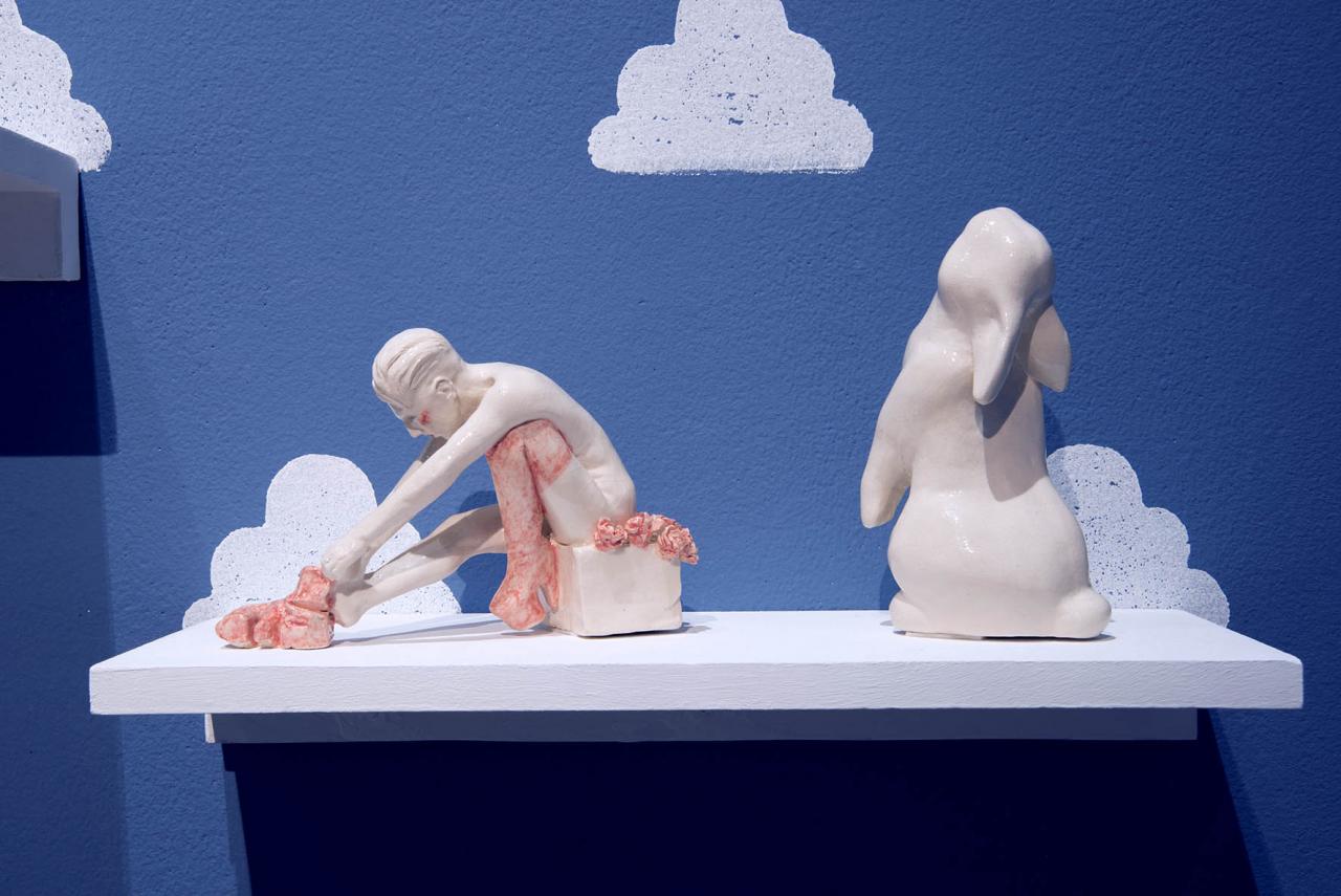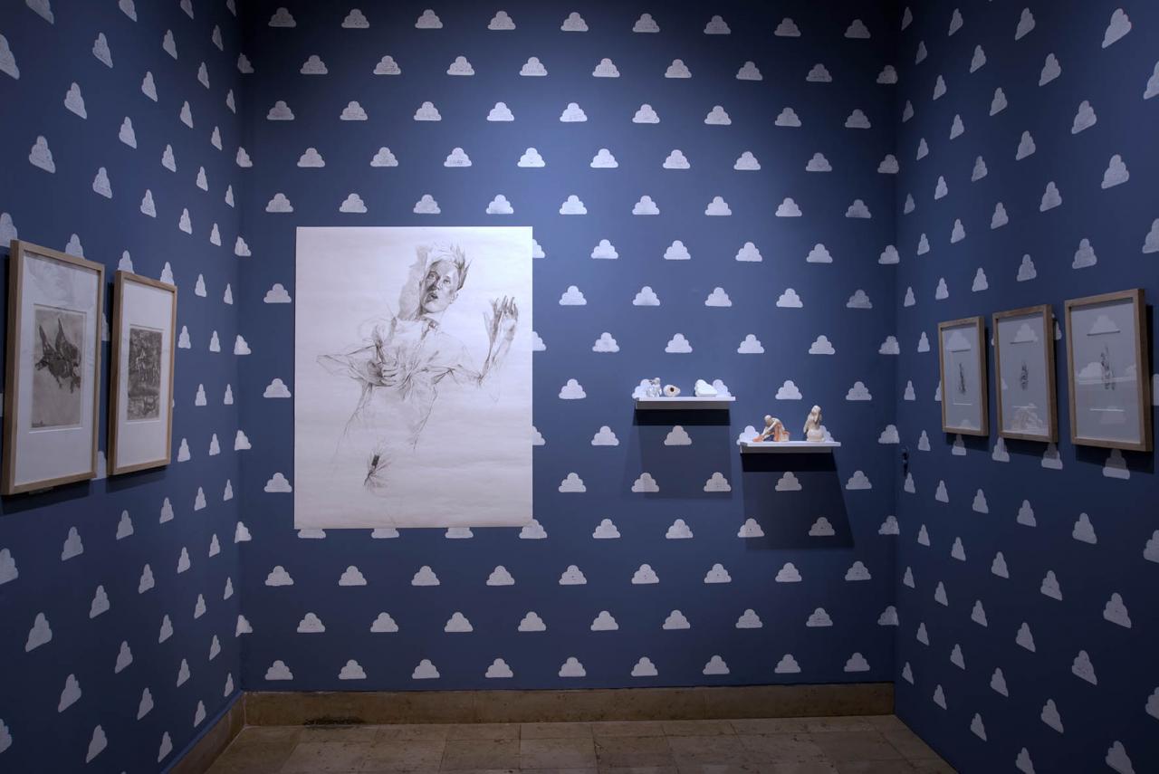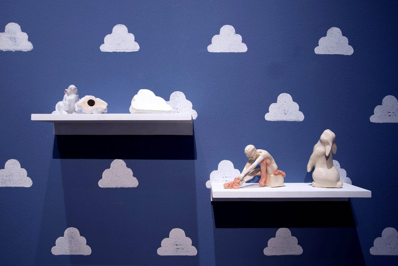 La couleur bleue et les nuages sont une évocation de la « Chambre bleue », le « décor » mental, l’arrière-plan, le contenant virtuel de beaucoup de mes œuvres : murs bleus, petits nuages blancs…