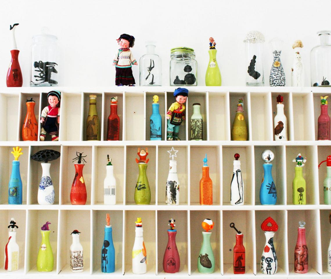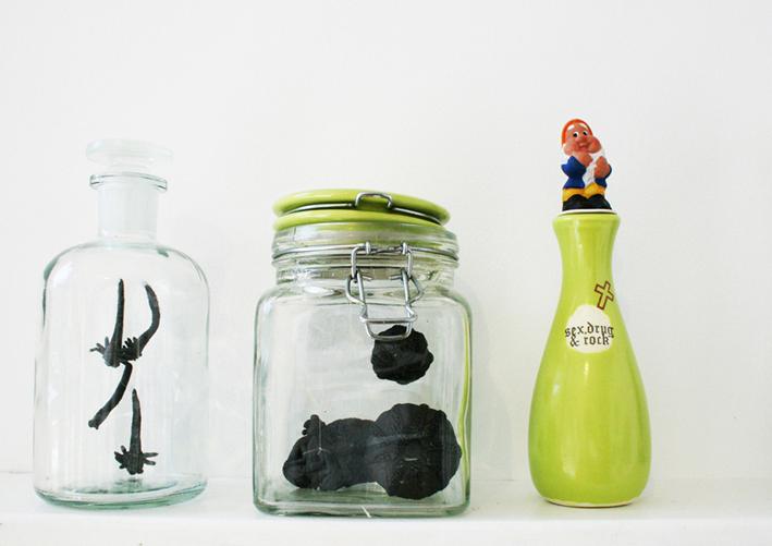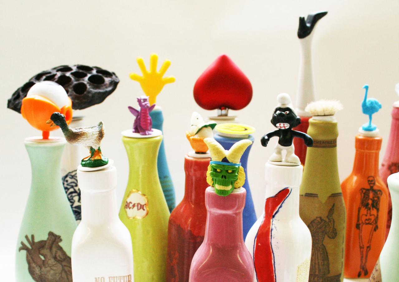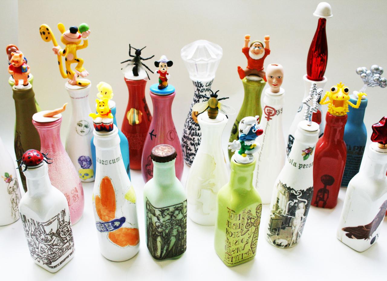 Chaque flacon est auréolé d’un bouchon original, la base est en porcelaine recouverte de latex blanc qui accueille soit un gadget plastique superficiel type cadeau Bonux, soit un élément naturel séché ou pétrifié utilisé dans les recettes magiques. Les flacons en porcelaine richement décorés contrastent soit avec le côté superficiel de la babiole d’enfant soit avec la simplicité de l’élément naturel.