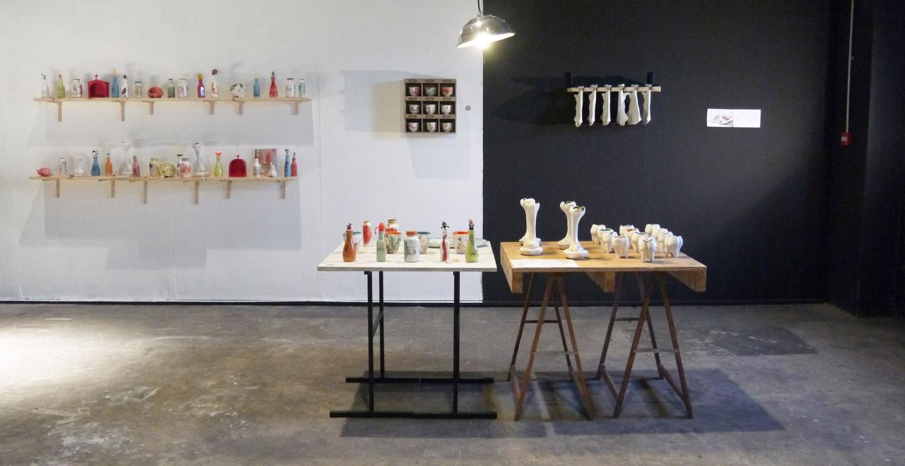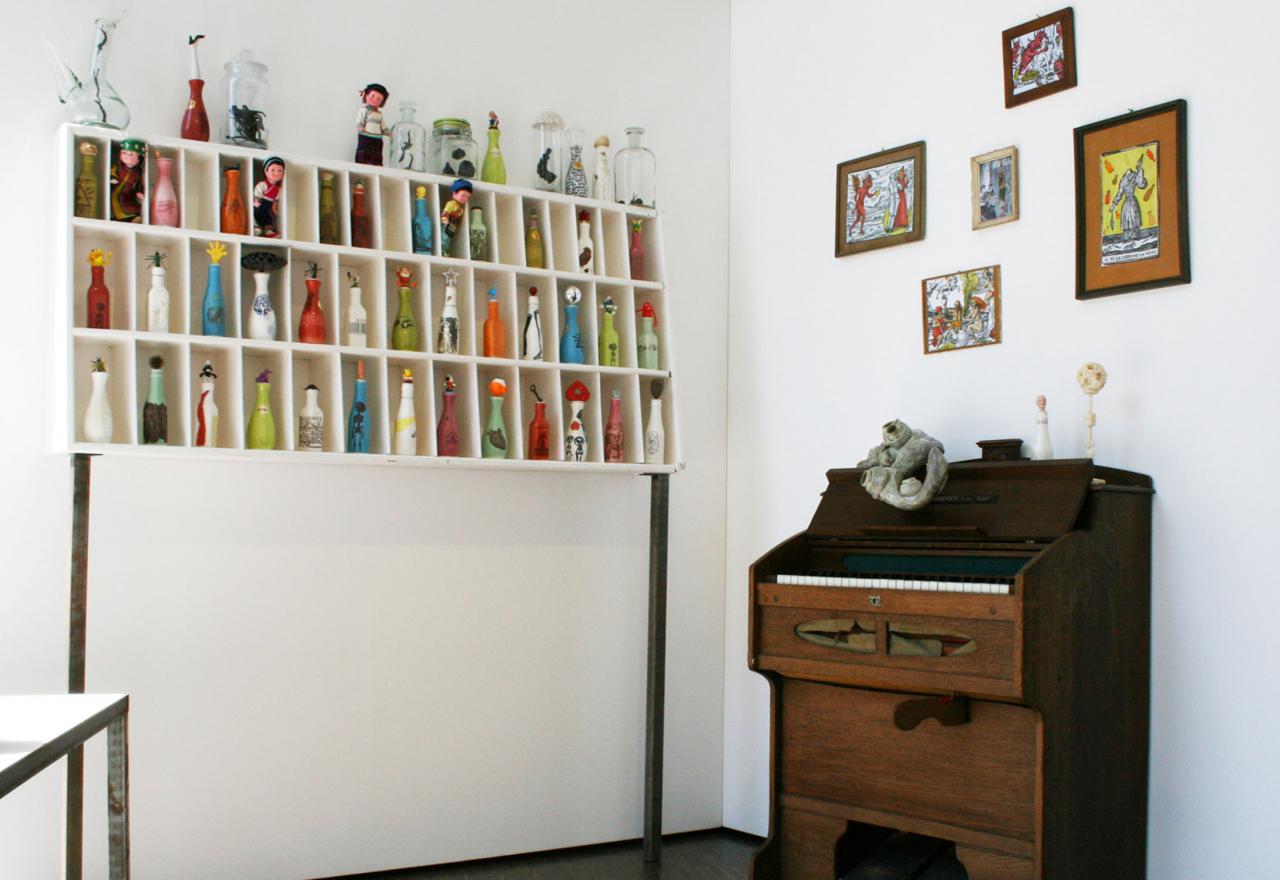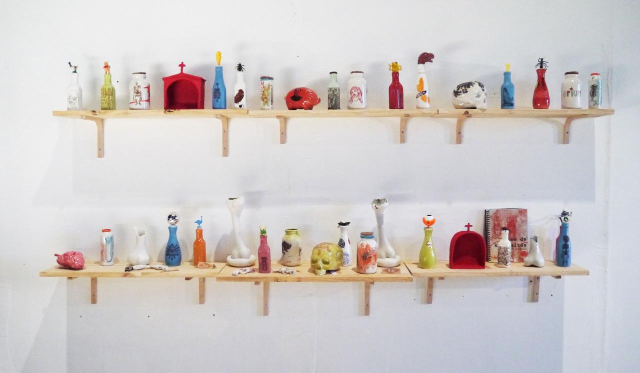 Chaque flacon est auréolé d’un bouchon original, la base est en porcelaine recouverte de latex blanc qui accueille soit un gadget plastique superficiel type cadeau Bonux, soit un élément naturel séché ou pétrifié utilisé dans les recettes magiques. Les flacons en porcelaine richement décorés contrastent soit avec le côté superficiel de la babiole d’enfant soit avec la simplicité de l’élément naturel.
