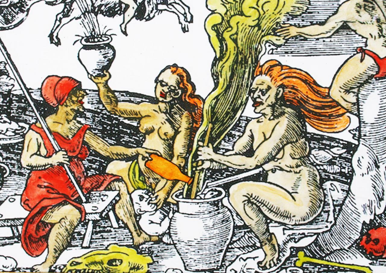 Accrochées au mur comme des photos de famille, des gravures encadrées représentent des scènes diaboliques, de sabbat ou de jugement de sorcière. Je les recolore et j’y représente par le dessin les flacons en porcelaine fabriqués pour le cabinet. »