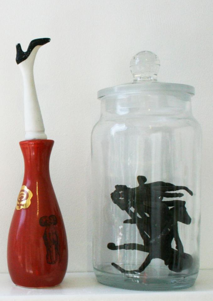 J’ai produit une série de flacons en porcelaine contenant les élixirs d’amour pour rendre les hommes fidèles. Sur leurs surfaces colorées se côtoient des images issues de cultures variées, comme une sorte d’anachronisme iconographique…