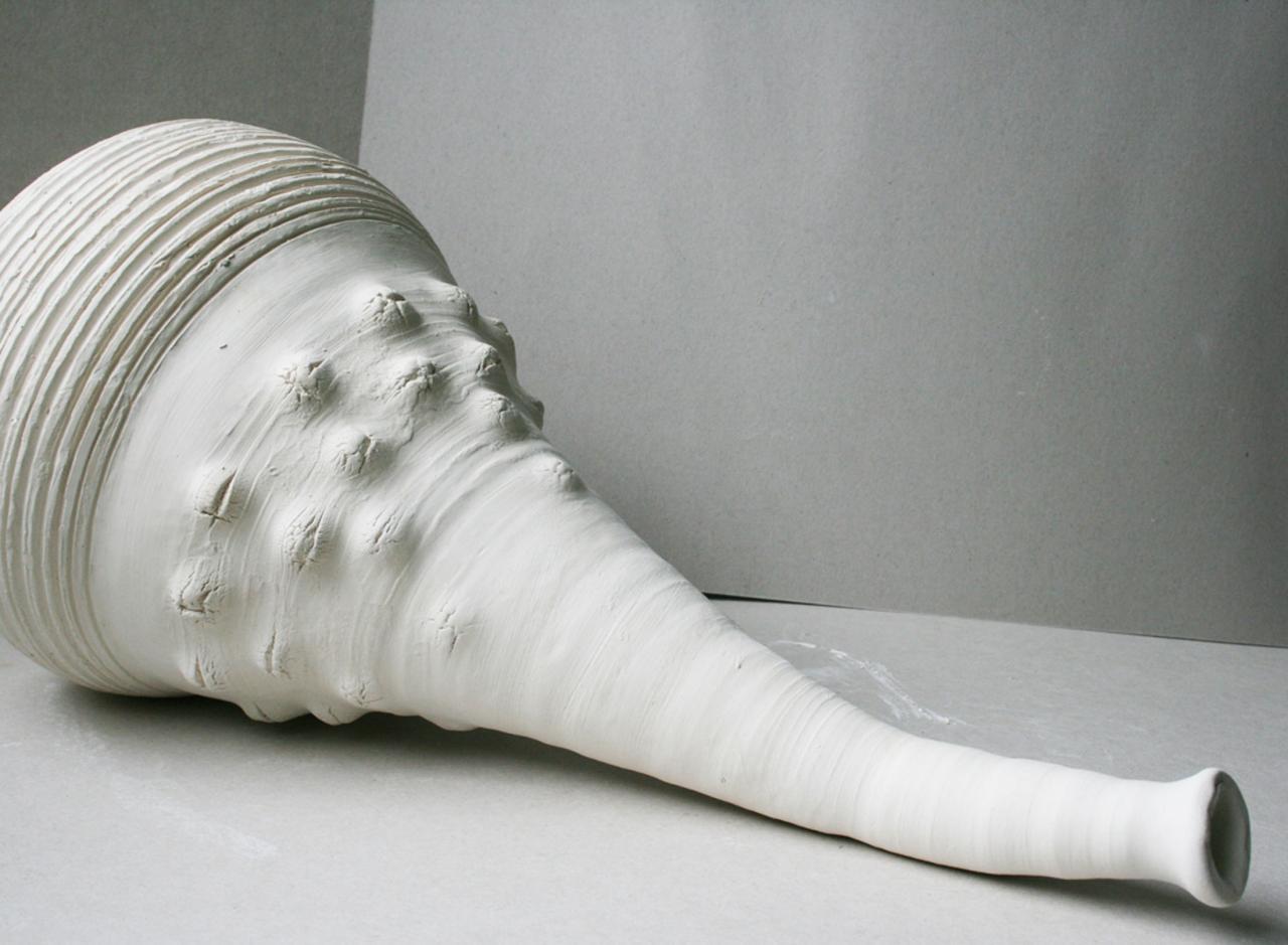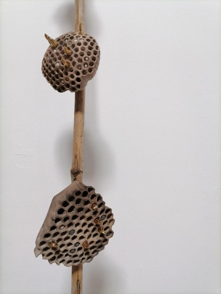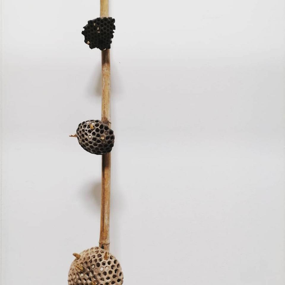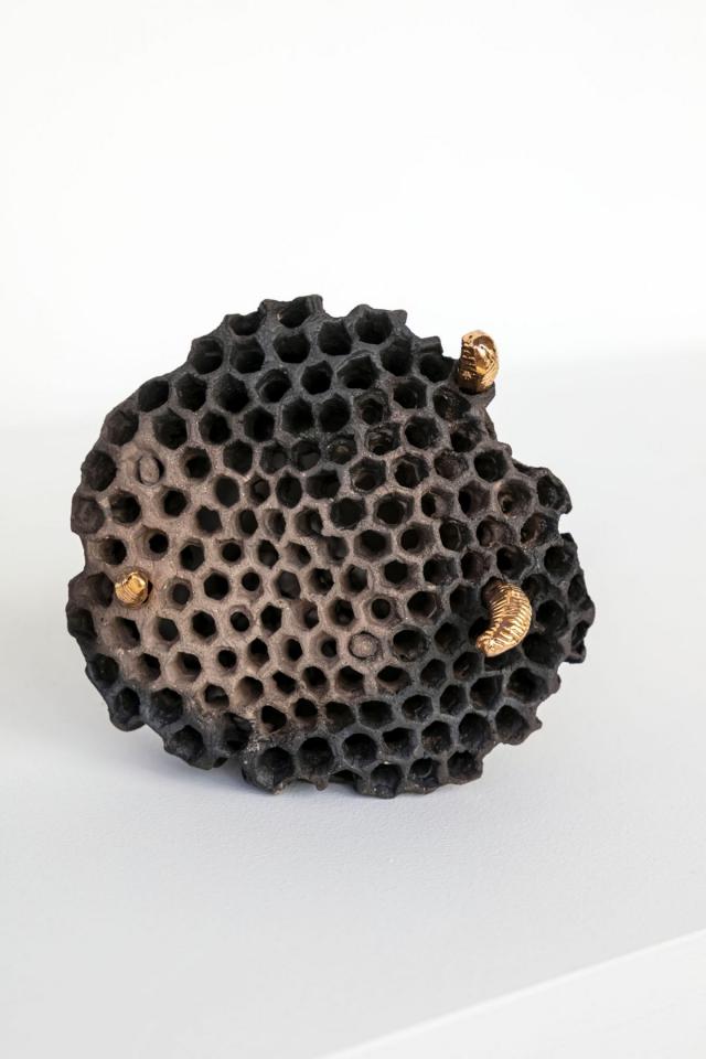 Grès enfumé, porcelaine émaillée, or petit feu, longueur 50 cm.