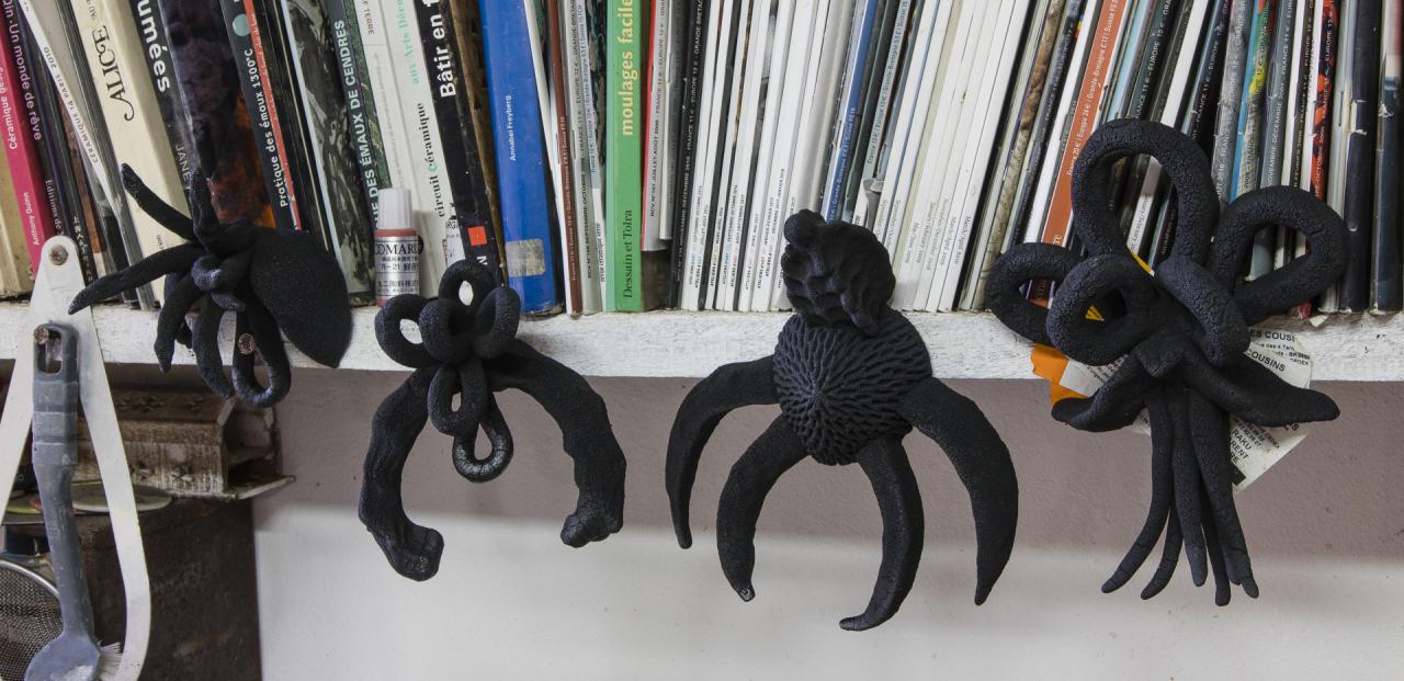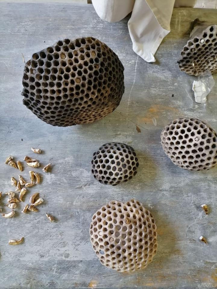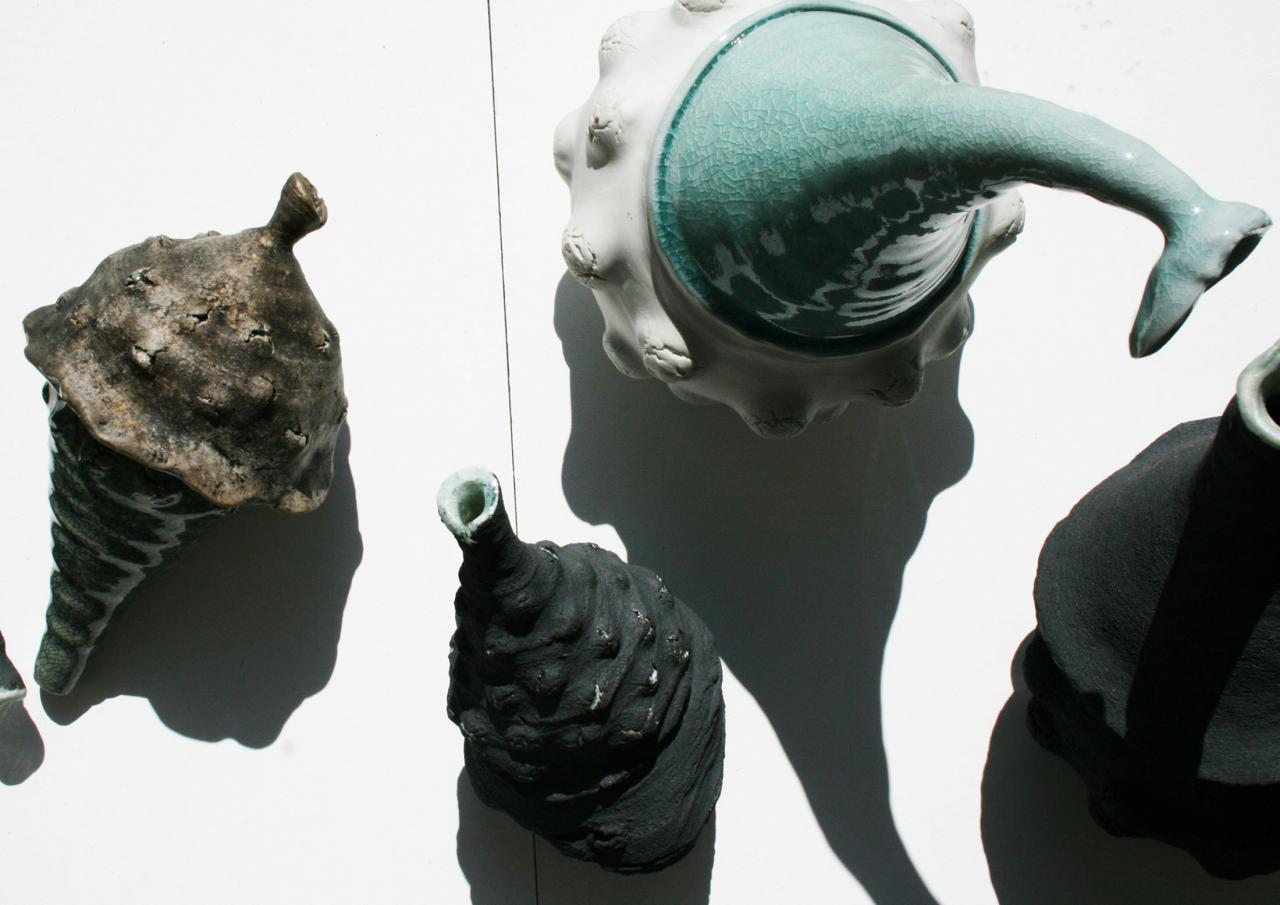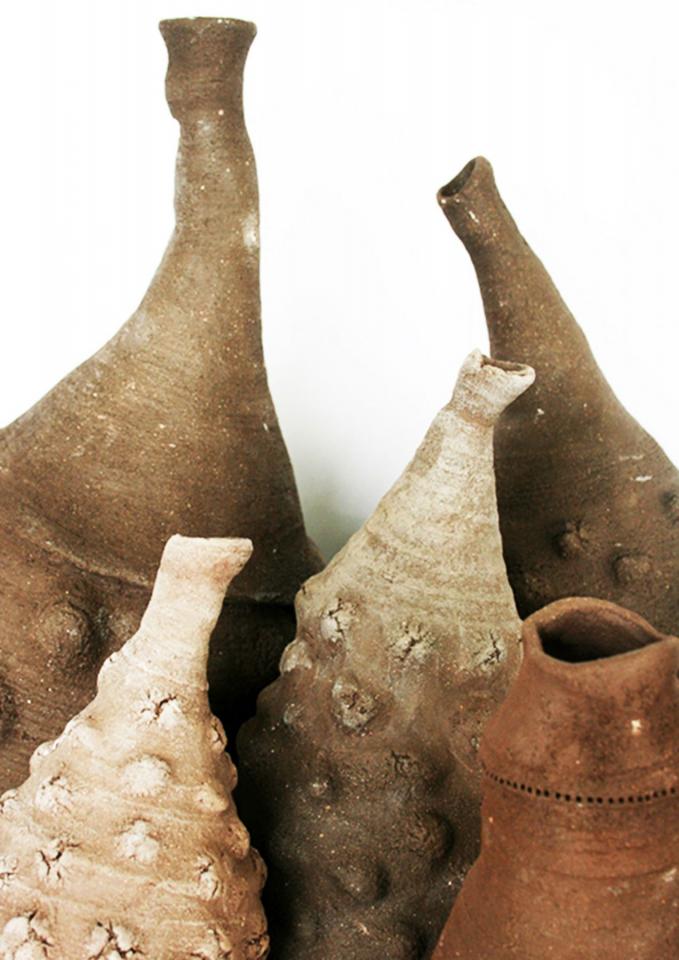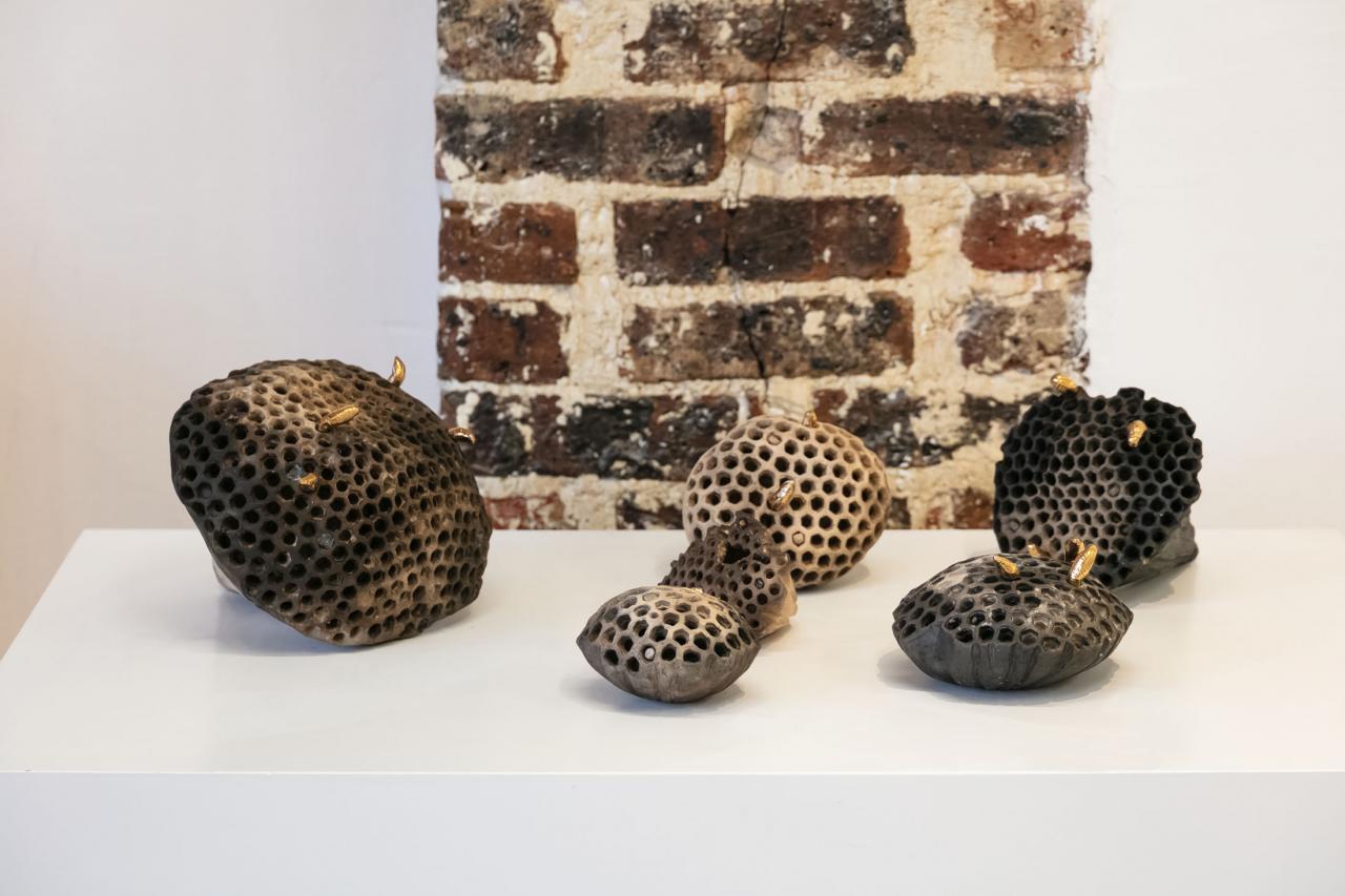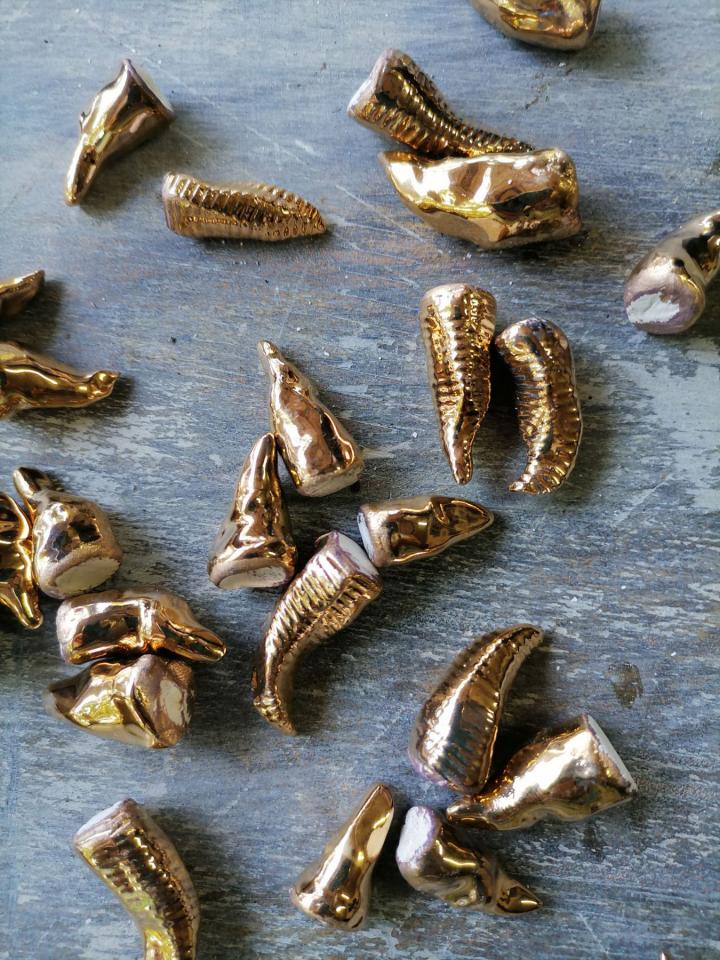Grès émaillé tenmoku, or petit feu, hauteur des grandes pièces 35 cm, hauteur des petites pièces 3 cm.