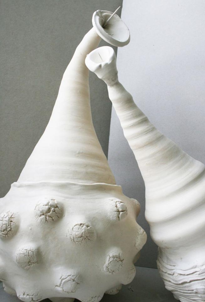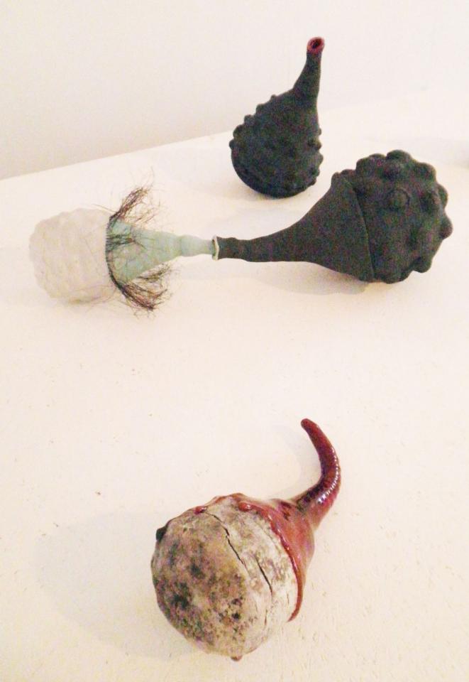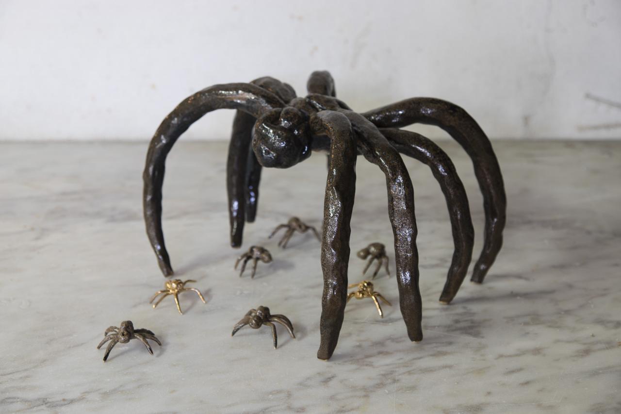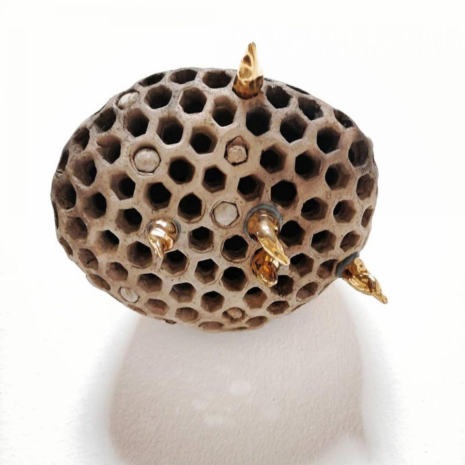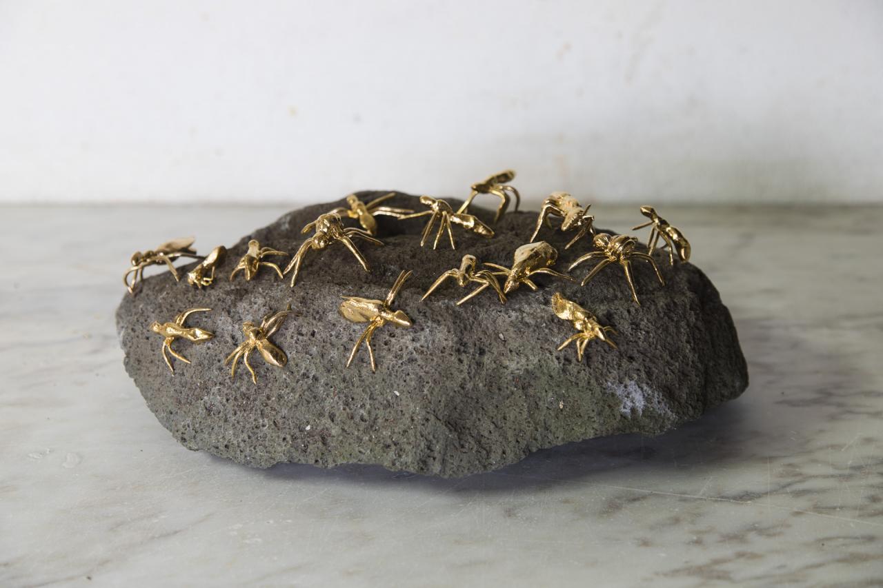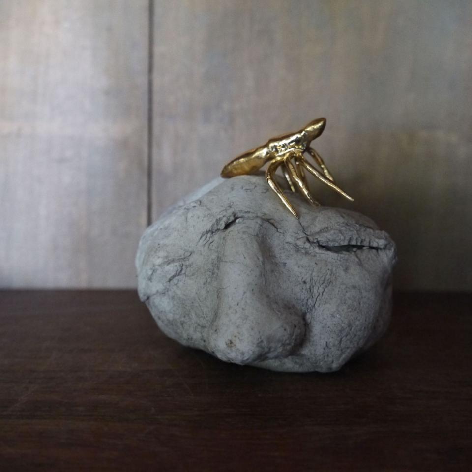 Grès émaillé tenmoku, or petit feu, hauteur des grandes pièces 35 cm, hauteur des petites pièces 3 cm.