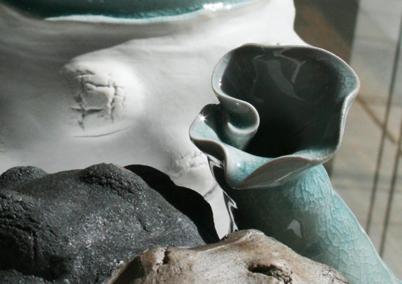 Porcelaine, grès de Yixing, émail céladon et sang de bœuf, cuisson gaz et enfumage, diamètre 20 cm.
