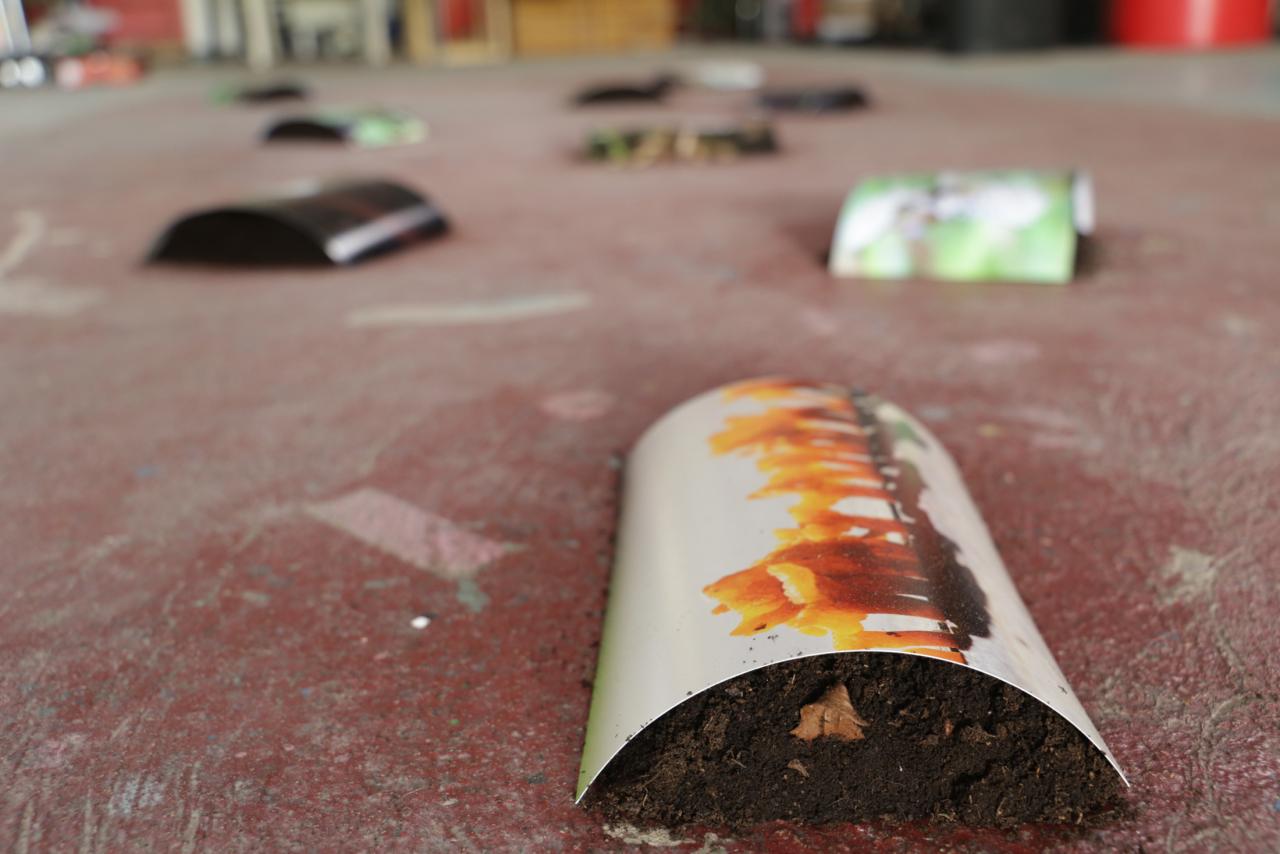 Installation de 11 tirages photographiques de 30 x 40 cm sur terre et feuilles mortes, dimensions variables.