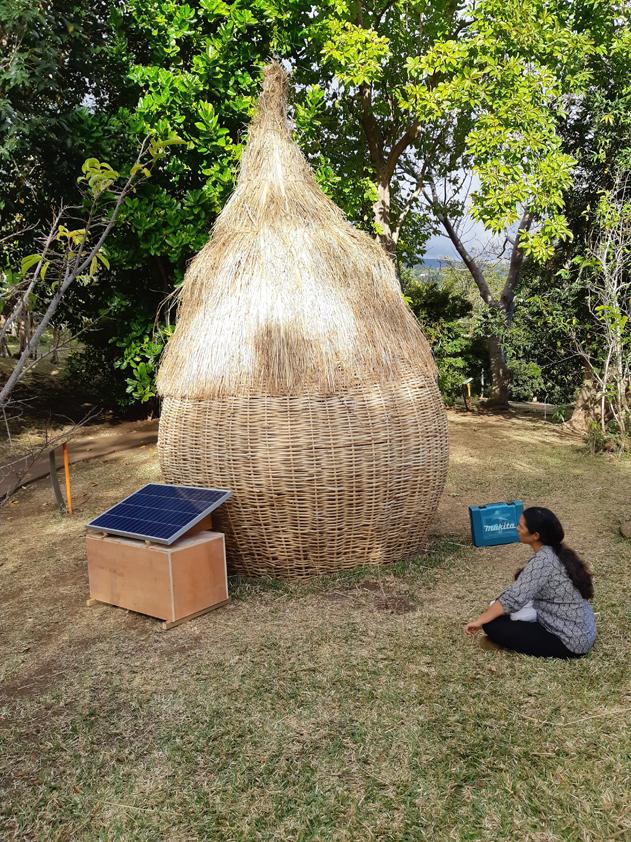 Un salon d’écoute. Création architecturale conçue avec les végétaux à proximité. Le bambou et le vétiver principalement ont été utilisés. La durée de vie de la structure végétale est variable. À Mascarin, Jardin botanique de La Réunion, elle a été exposée deux ans. Ce dispositif renferme un système de diffusion sonore alimenté par un panneau solaire. Dispositif extérieur et autonome. On pouvait y écouter une série d’entretiens avec des botanistes, des naturalistes, des acteurs du territoire réunionnais dans le domaine de l’environnement et de la protection de la biodiversité. Les entretiens étaient menés autour du thème : les espèces exotiques envahissantes.
