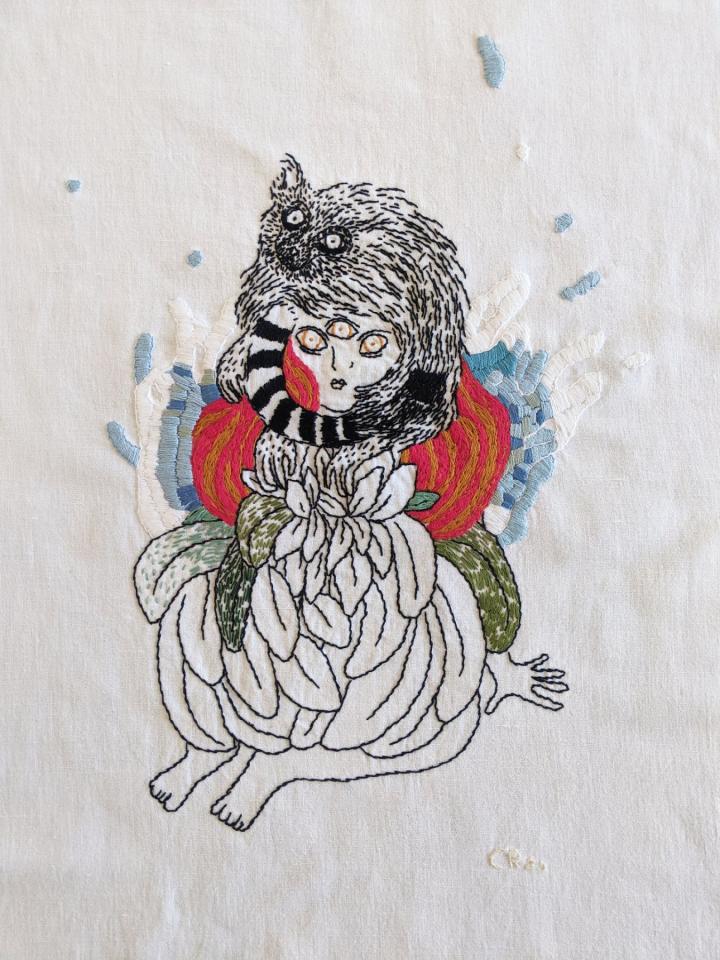 Georges, 2024Broderie au fil dmc sur nappe ancienne, 30 x 20 cm