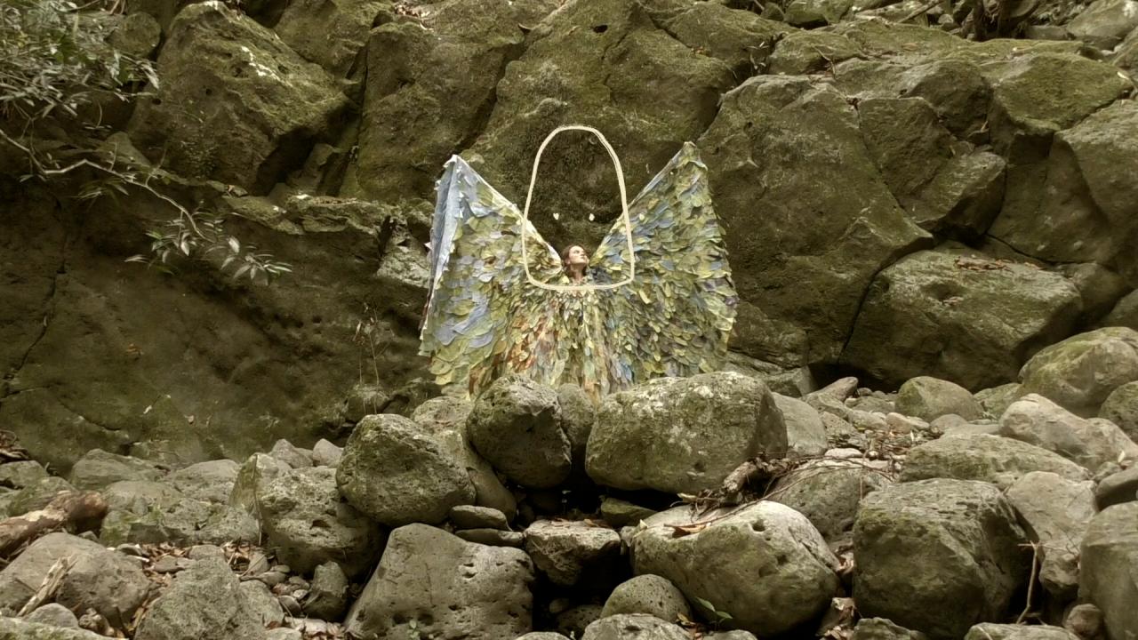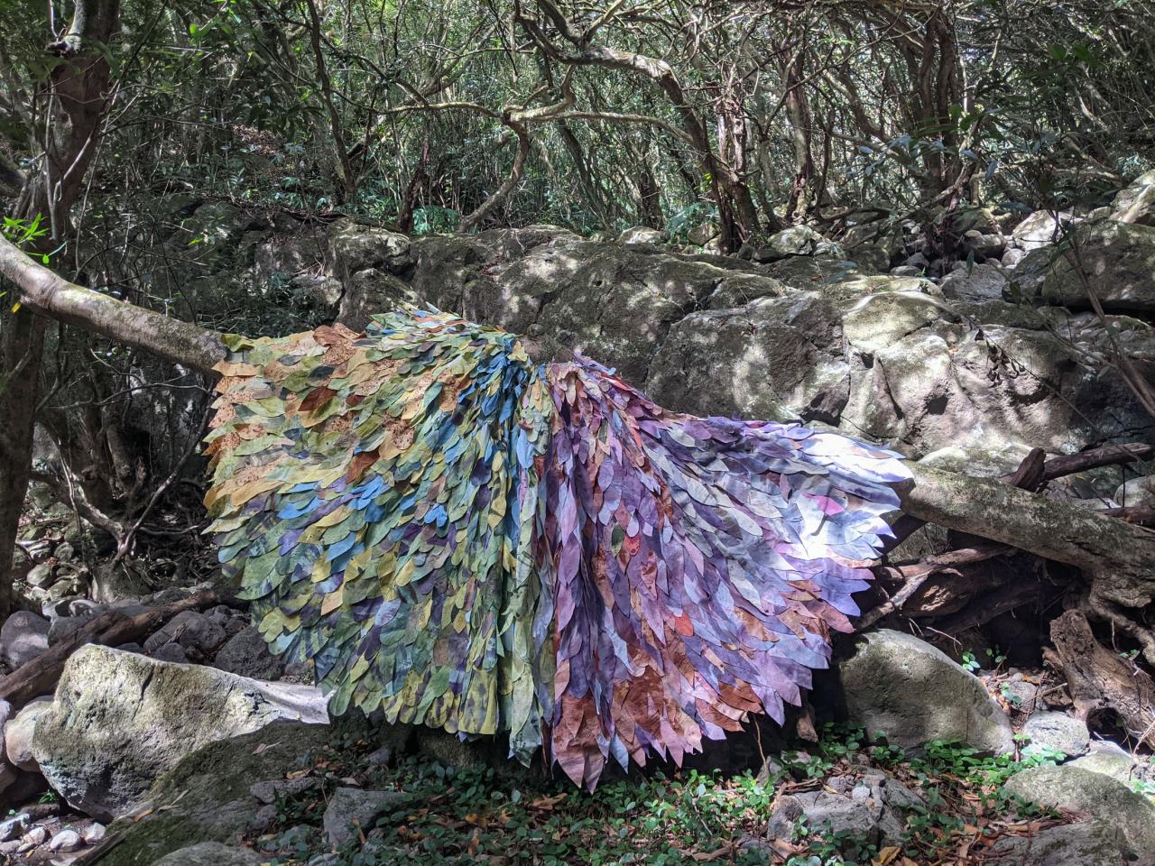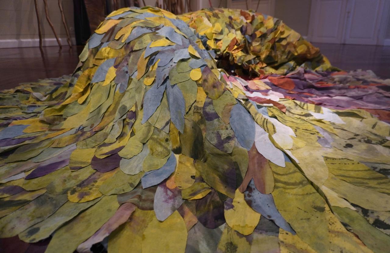 « Inspirée par le mouvement de Loïe Fuller, la robe est composée de deux grands cercles de tissu, pour le devant et le dos. Teinte à la main avec des couleurs végétales, elle est rehaussée d’encres artisanales. Chaque pièce de tissu, découpée en formes de feuilles, coraux et plumes, recouvre entièrement sa base.