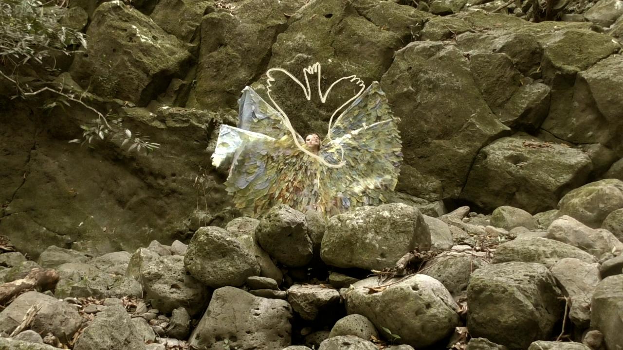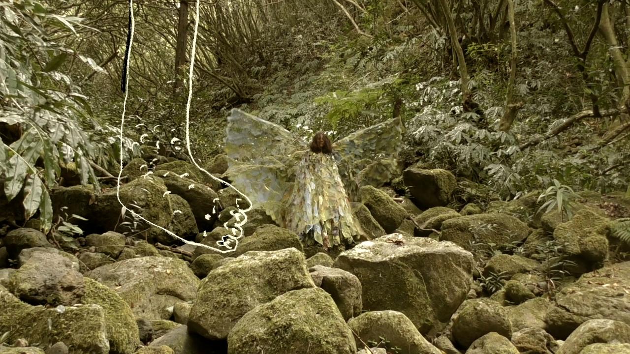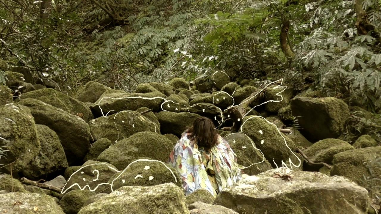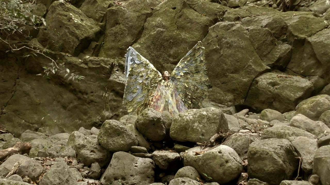 « Inspirée par le mouvement de Loïe Fuller, la robe est composée de deux grands cercles de tissu, pour le devant et le dos. Teinte à la main avec des couleurs végétales, elle est rehaussée d’encres artisanales. Chaque pièce de tissu, découpée en formes de feuilles, coraux et plumes, recouvre entièrement sa base.