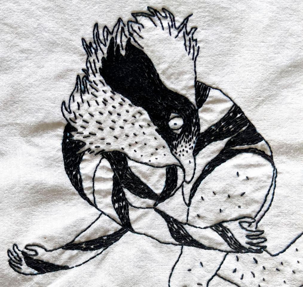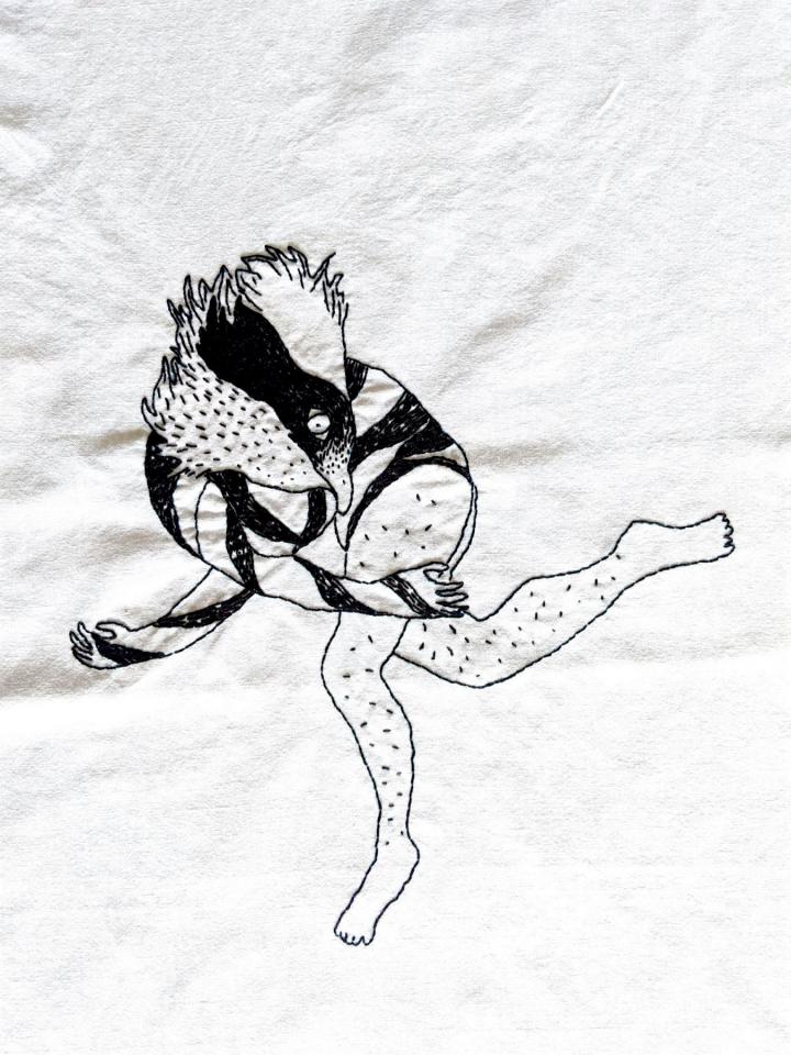 Pascal, 2024Broderie au fil DMC sur morceau de nappe ancienne, 30 x 20 cm.