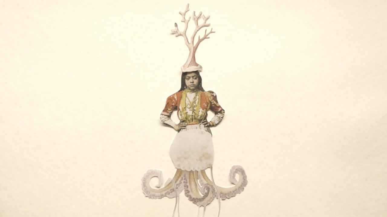 Traduction : « la sirène ». À Madagascar, elle est bien réelle, apparaît sous différentes formes pour interagir avec le monde des humains. Cette vidéo est une récolte de témoignages. Elle a été montrée une fois à Tamatave, et une deuxième fois pour l’exposition individuelle Chanter pour les os, danser pour la chair. »