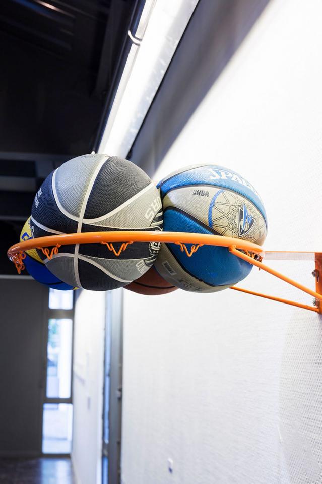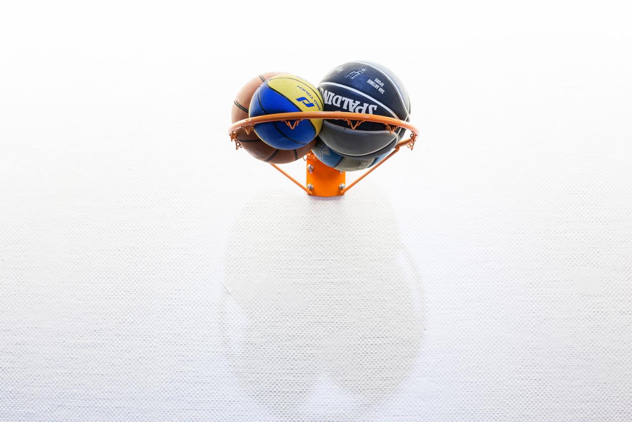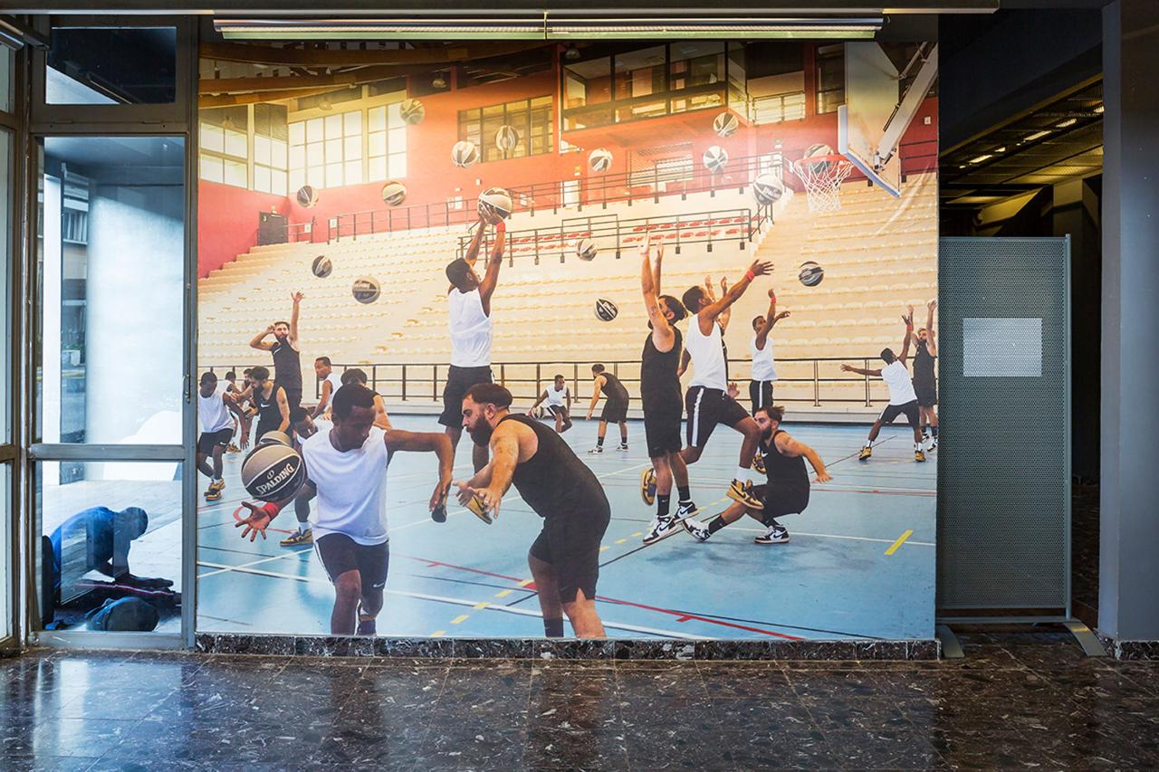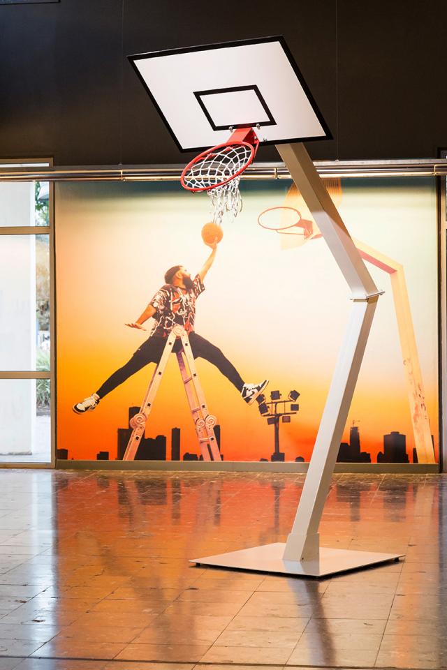 Photo-performance, escabeau et panier de basket, fond photomonté.