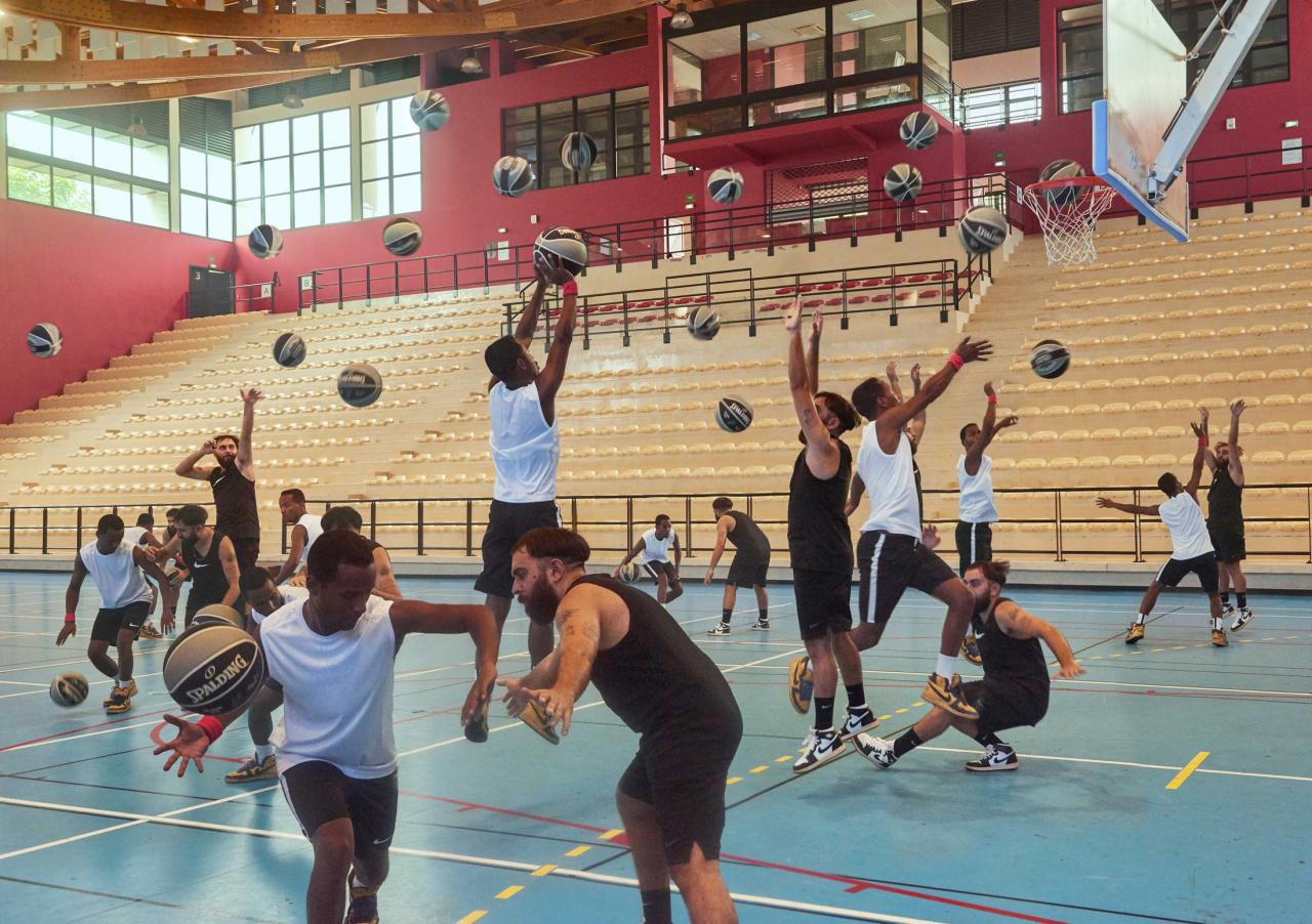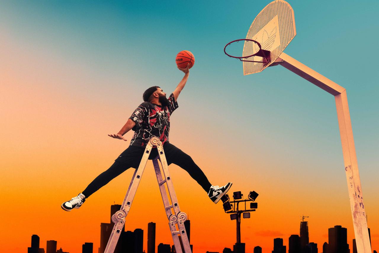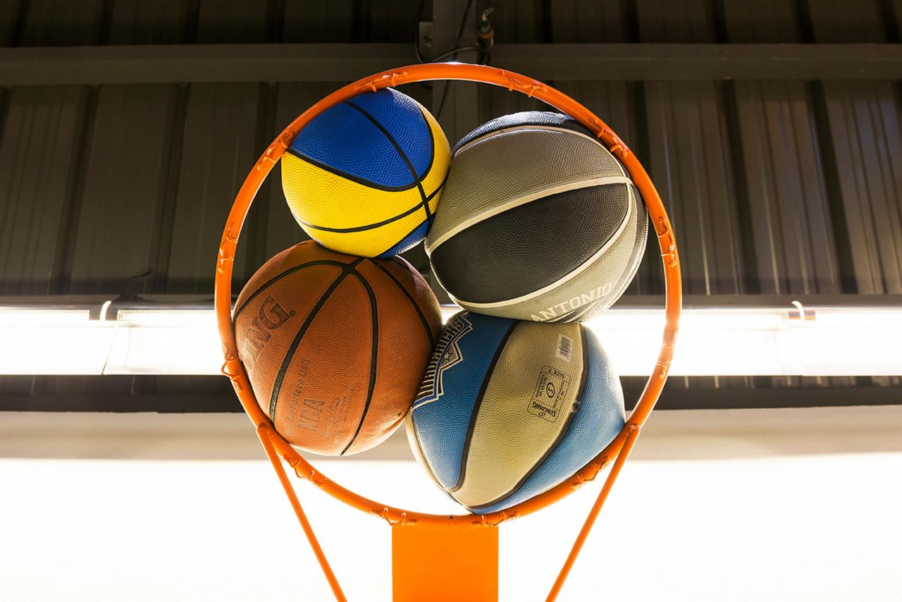 Photo-performance, escabeau et panier de basket, fond photomonté.