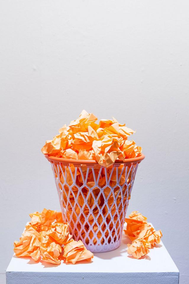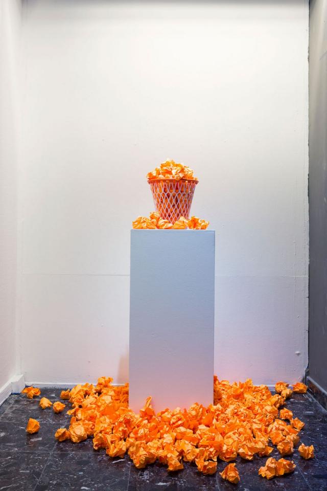 Installation, socle, poubelle plastique et papier machine, dimensions variables.