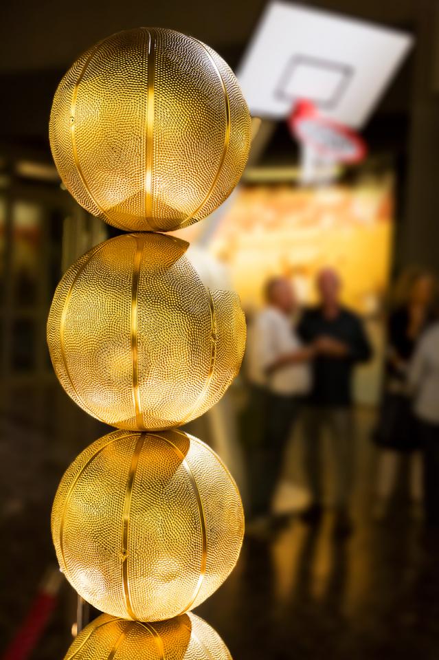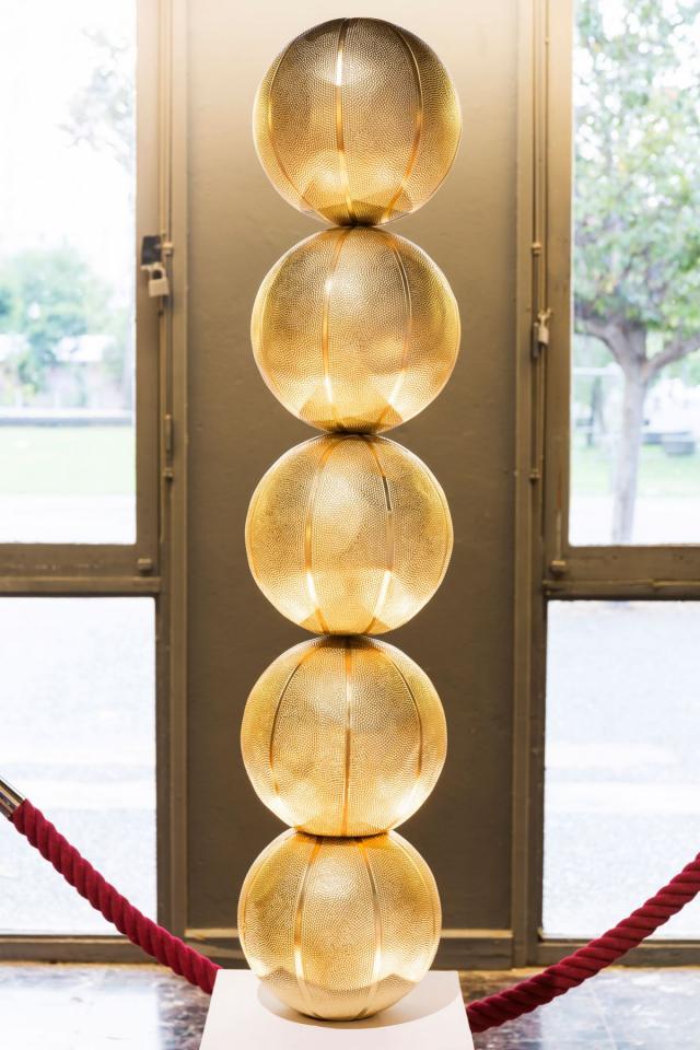 Installation, socle, ballons de basket peints à la bombe. Hauteur 175 cm, diamètre 45 cm.