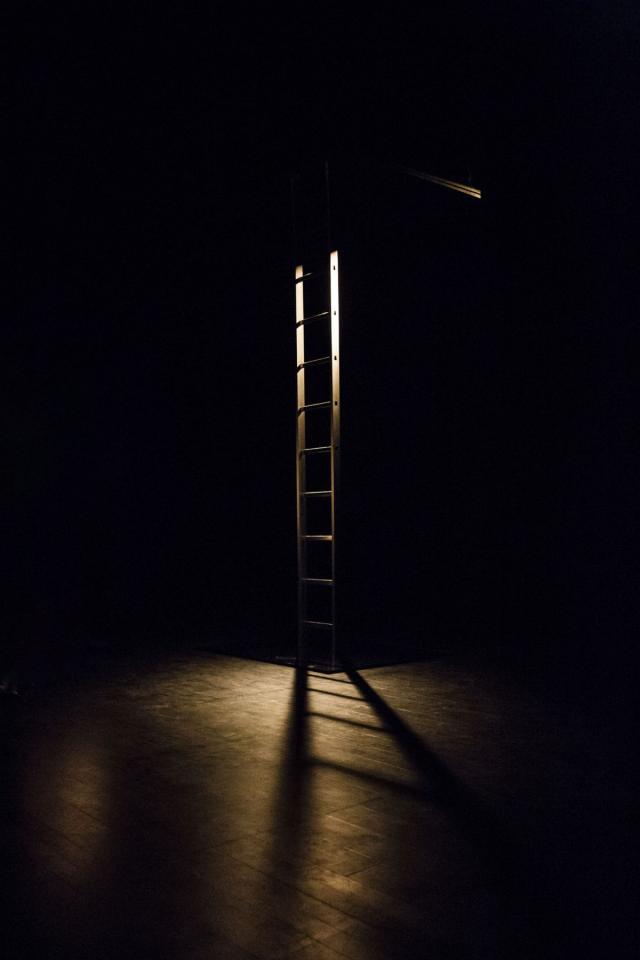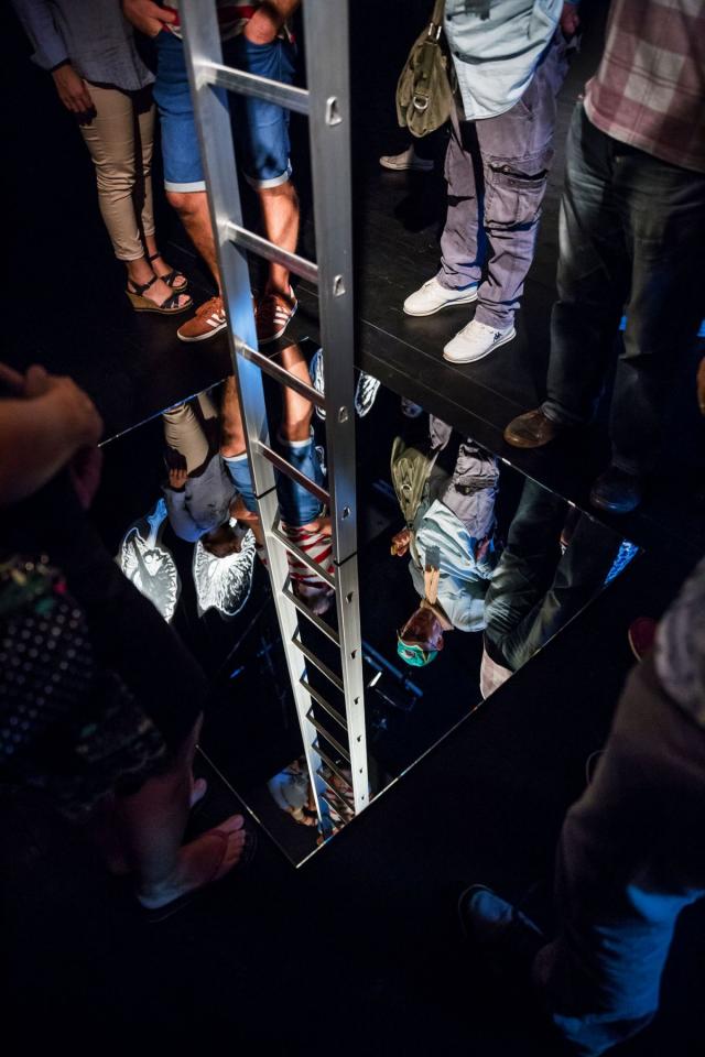 La deuxième proposition est un effet d’optique rudimentaire où une échelle droite avec deux miroirs produit un vertige infini. Le spectateur se penche et découvre son buste, ceux des voisins en même temps, plongés dans cet abysse d’une échelle sans fin qui monte et descend selon son regard. Intitulée Vers l’infini et au-delà - clin d’œil vers une œuvre populaire qui n’est pas sans écho avec l’enfance -, cette installation réussit à provoquer une sensation physiologique première chez chacun. L’artiste, sans discours préconçu, arrive à nous réunir - en dehors de nos histoires et de nos savoirs -, par quelque chose de commun. Et ce partaz passe ici par une impression physique née d’un regard qui cherche un repère. Réponse pertinente, espiègle presque, à ce titre qui annonçait de l’égarement. »