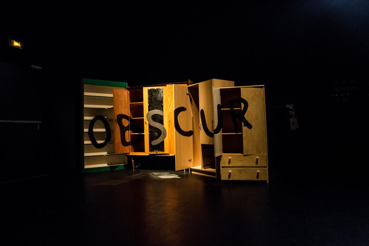 Dans ce contexte, Clément Striano a présenté deux installations très différentes bien qu’axées sur une récurrence centrale chez cet artiste : l’endroit précis du point de vue. Que ce soit avec Obscur ou Vers l’infini et au-delà, il oblige ou invite le spectateur à être dans le bon angle, le bon axe pour que se découvre l’effet, la lecture, l’ensemble. Constituée de meubles communs et pauvres, « Obscur » assemble des lignes droites, des portes ouvertes, des étagères vides, des miroirs pour former une installation inquiétante. Les battants et fonds des meubles sont supports du mot Obscur peint en noir à la main, lisible uniquement dans un certain axe. L’œuvre, toujours dans cette simplicité de moyen qui caractérise le travail de Striano, n’est pas sans écho avec d’autres créations produites avant ou après cette exposition.