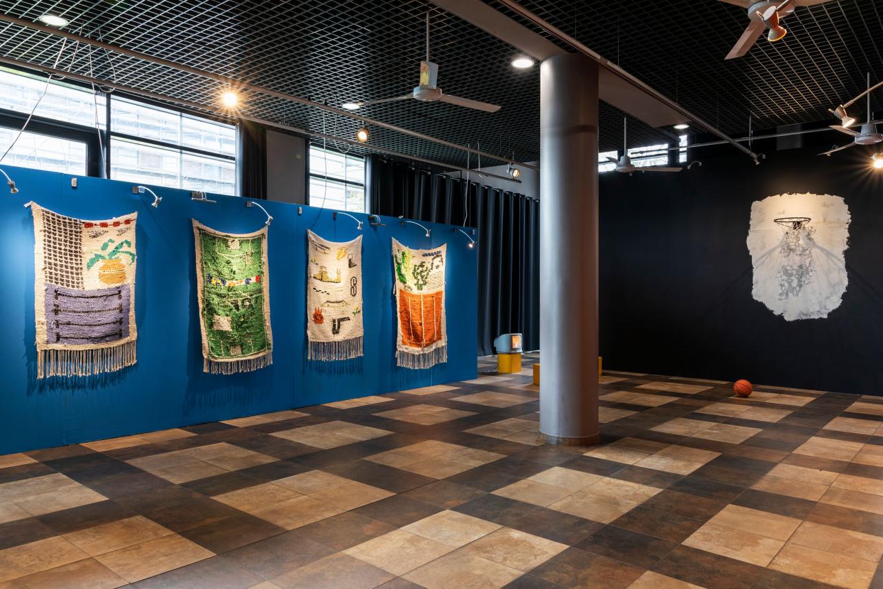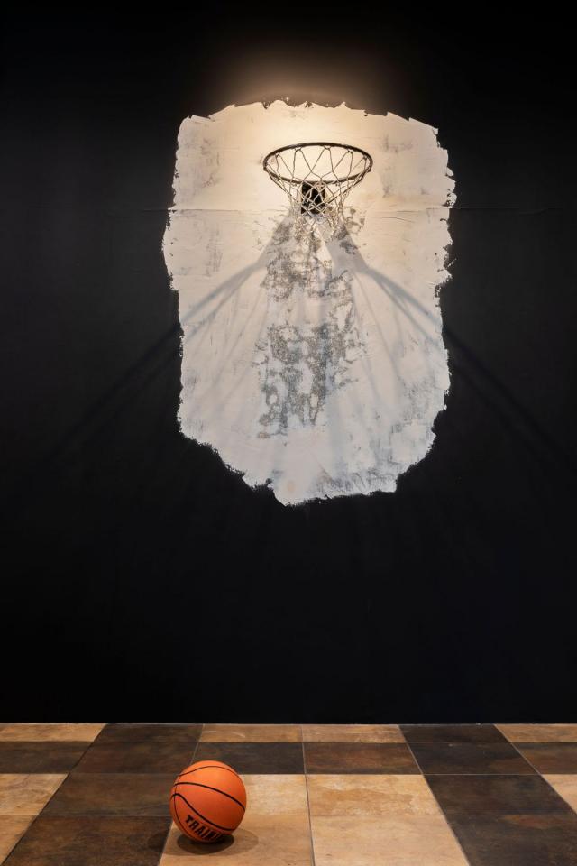 Installation, panier de basket, filet brodé avec la technique du jour de Cilaos.