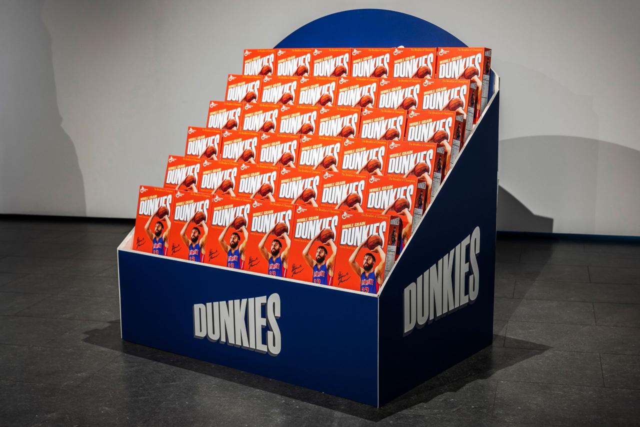 Le récit de son parcours est envisagé comme une saga en plusieurs épisodes. Il est construit au fil des œuvres et au fil des publications sur le compte Instagram Dunkorama. Post après post, nous rencontrons des photomontages dans lesquels l’artiste intègre le visage de Clément Striano, qui n’est autre que le visage de l’artiste lui-même. Les photographies manipulées présentent Clément Striano affrontant les plus grands joueurs de la NBA. À commencer par la plus grande des légendes : Michael Jordan. Le héros absolu de l’artiste depuis les années 1990. Enfant et adolescent, il a cultivé sa fascination envers Jordan en se nourrissant de matchs à la TV, de magazines spécialisés, de posters, de films (Space Jam, 1996), de la musique, de cartes de collection, de vêtements et autres produits dérivés. Avec Michael Jordan, l’artiste s’est forgé une culture ancrée dans celle des USA. Contrairement au phénomène de starification de Michael Jordan et d’autres légendes de la NBA, l’artiste crée une figure discrète dont le récit de vie n’est jamais glorifié. Une anti-icône qui ne ménage pas ses efforts et sa persévérance. Le joueur fictif joue quelques matches, apparaît sur les photos en compagnie de ses camarades les plus connus. Il porte le numéro 23 : celui de Michael Jordan, celui du jour de naissance de l’artiste. Il bénéficie d’un logo, de cartes de collection signées, de maillots à son nom, de poster, d’effigies en carton à échelle 1, de ballons dédicacés, de coupes, de trophées et même d’une marque de céréales. Son nom devient une marque de produits dérivés que les fans de basket ne vont pas vraiment s’arracher. L’artiste fabrique ainsi une semi-légende en déployant à la fois en ligne et dans les espaces d’exposition tous les éléments du décorum de l’autofiction. Il s’agit pour l’artiste de « rester dans le potentiellement viral et plausible ». Il s’amuse de la réaction des spectateur·trices des expositions lorsqu’il se présente à elleux. Les preuves d’existence se multiplient. Entre les photographies des entraînements réalisées au gymnase de La Possession, le prototype de basket sponsorisé par Decathlon, les sérigraphies (technique de prédilection de l’artiste) des maillots, des publicités : les œuvres engendrent un trouble entre la réalité et la fiction.