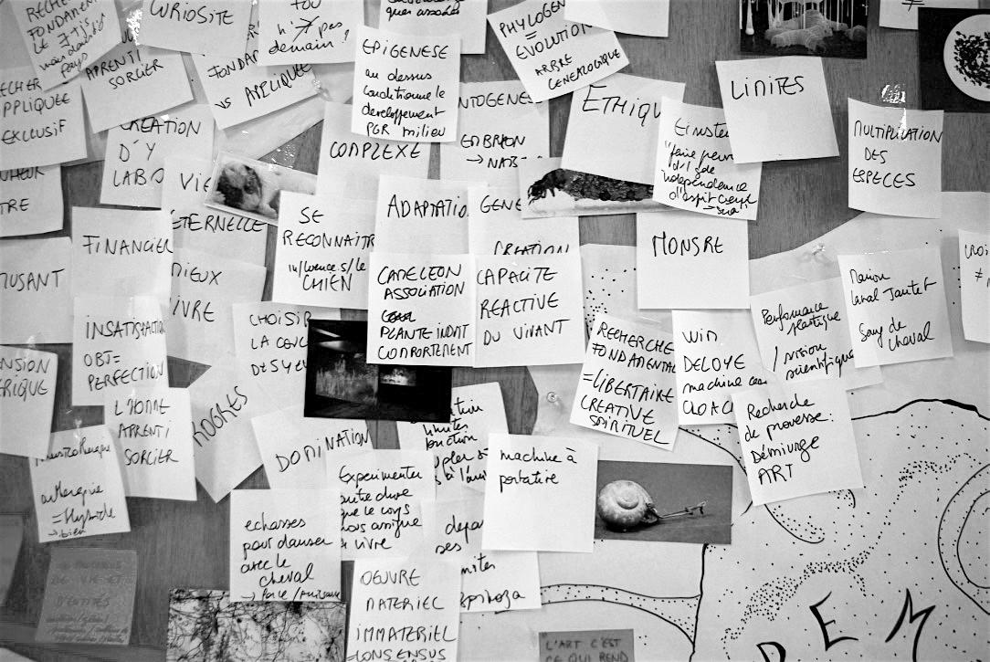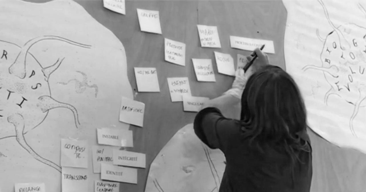 L’idée consiste à intervenir le moins possible pour que les échanges rebondissent dans la salle. L’artiste se contente de transposer les mots et les idées sur le mur et relance le débat en cas de blanc prolongé. Une fois que toutes les questions du bocal sont prélevées et lues, un nouveau bocal est ouvert pour que le débat continue. Lorsque les bocaux ne contiennent plus de questions, le dispositif s’arrête. La carte mentale sur le mur constitue une trace, une pièce éphémère destinée à être détruite. L’œuvre se génère dans la relation qui se joue entre les personnes présentes dans le dispositif, la matière (dessins, feutre, papier, mur) sert de catalyseur de la pensée.