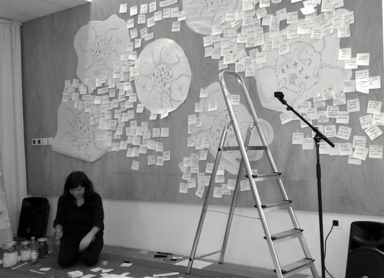 La performance commence. L’artiste enfile un gant de chirurgien transparent et prélève avec une pince en métal une bandelette de papier dans le premier bocal. La question est lue devant le public et chacun donne son point de vue. Au cours des échanges, les mots sont pris à la volée, écrits au feutre noir sur des petits papiers carrés. Puis ils sont collés avec du scotch sur les neurones/thèmes de la carte mentale auxquels ils correspondent.