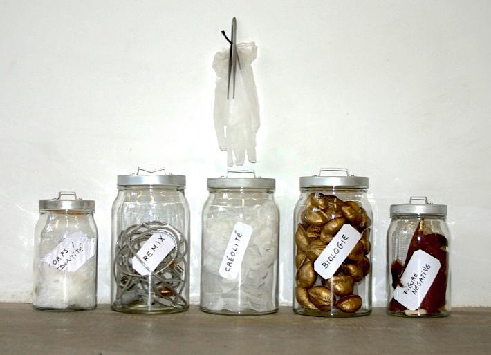Le jour de la performance, le public est attendu dans l’atelier aménagé en salon confortable avec moquette, coussins, canapés, éclairage tamisé, bouteilles d’eau. Pour fluidifier les débats et diversifier les points de vue, un panel d’une vingtaine de personnes est invité à l’avance à participer aux rencontres : artistes, philosophes, historiens, biologistes, médecins, enseignants, étudiants, juristes, économistes, chercheurs, etc. Le public est invité à se joindre à l’assemblée présente et à participer tout au long de la soirée. Le mur de l’atelier est préparé à recevoir des mots et remarques de l’assemblée. Il est recouvert de dessins (5 neurones dessinés autour d’un neurone central). Chaque neurone est signifié par un des thèmes définis. Les questions sont imprimées sur du papier et découpées en bandelettes. Elles sont insérées dans des bocaux de verre transparents contenant des matières symboliques reliées aux thèmes étudiés :