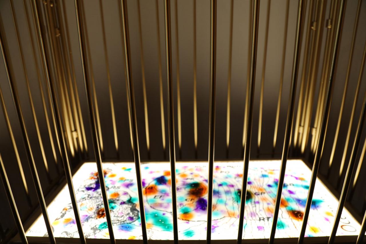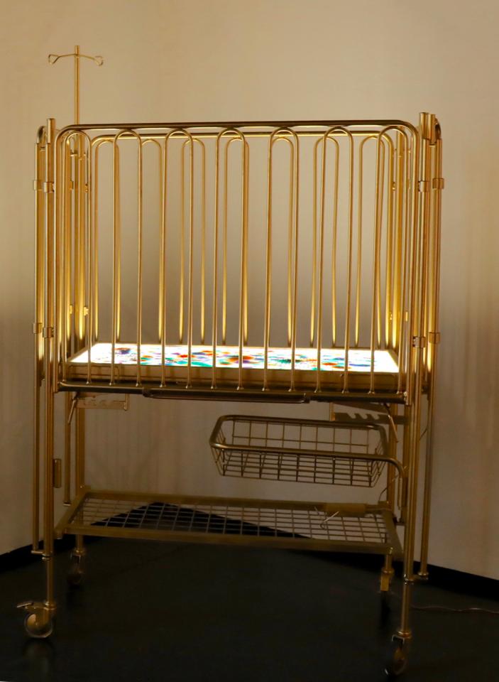 Celui-ci a lieu dans une salle d’exposition conçue selon les codes de monstration du white cube. Le milieu est froid, presque stérile. Le lit surélevé et la présence des barreaux métalliques enclosent encore l’expérience, la privent de relations avec l’extérieur. L’or alchimique va-t-il empoisonner les cultures de bactéries ? Une sensation de trouble émane de ce dispositif. La culture peut-elle vraiment prendre ?