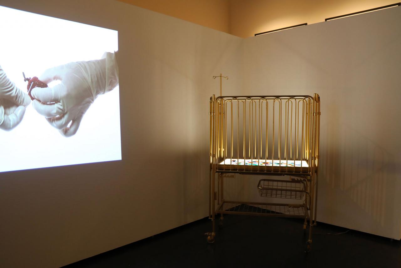 Installation, technique mixte (Lit médicalisé, peinture, table lumineuse, encres, gelée Mueller Hinton, 120 x 600 x 170 cm.