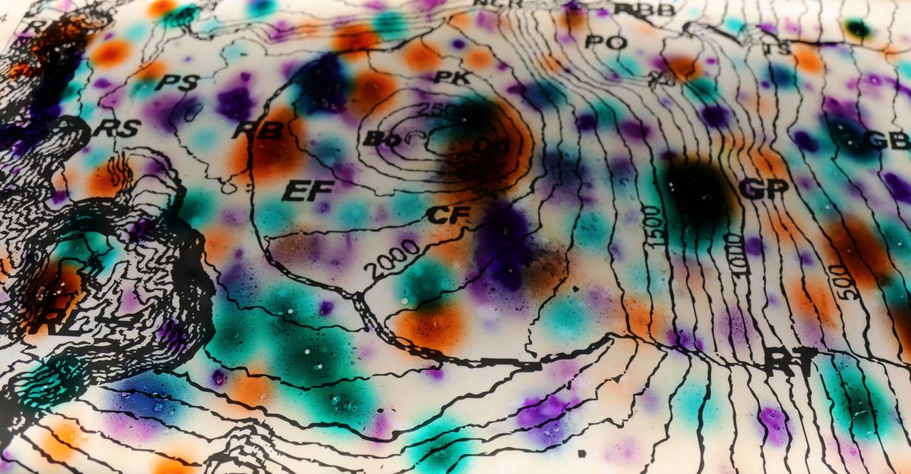 « L’installation Débords nous met en présence d’un lit d’enfant médicalisé peint de couleur dorée. À l’intérieur, sur une table lumineuse épousant les dimensions du sommier, une carte topographique dessine l’enclos du volcan de La Fournaise. De la gelée Mueller Hilton (substrat de culture cellulaire et bactériologique) est étalée sur la carte avec des encres de couleurs différentes.