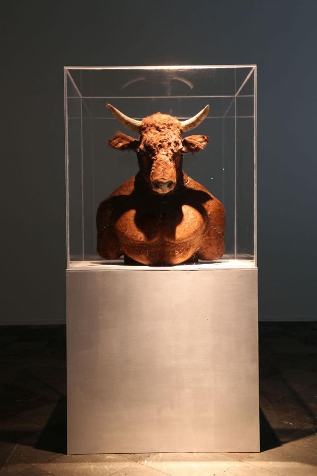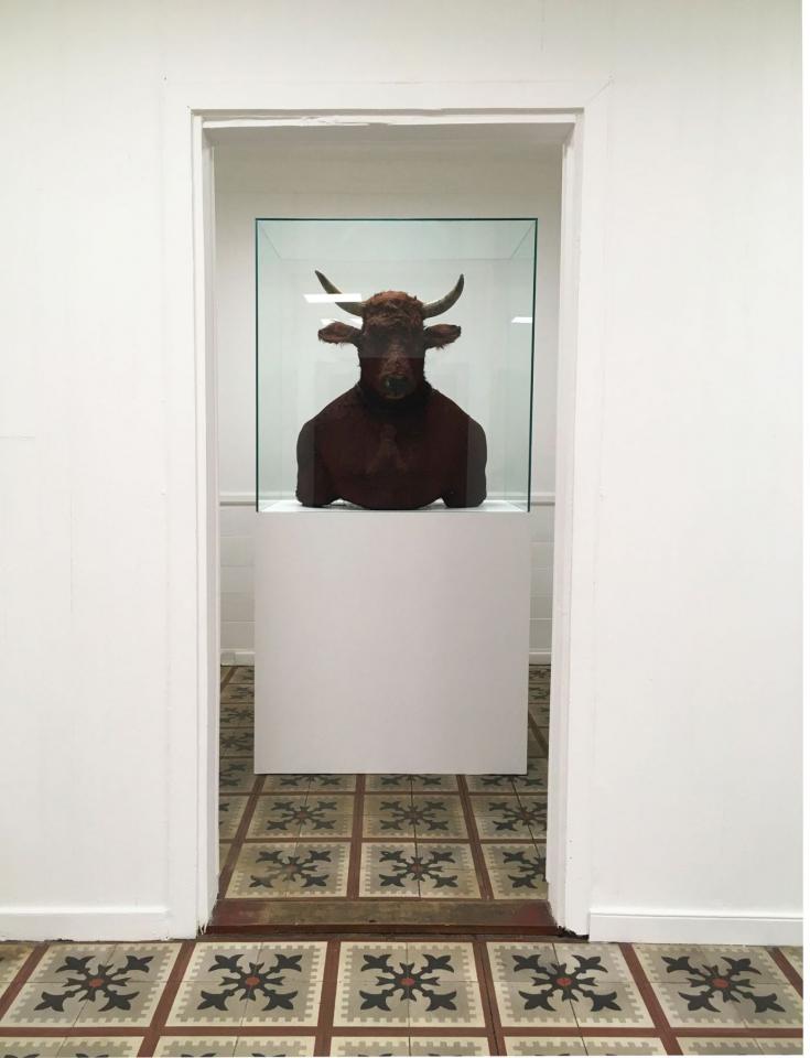 « Minotaure, œuvre créée en 2015 dans le cadre d’une résidence au Muséum d’histoire naturelle de La Réunion est né de l’imagination de Clotilde Provansal qui tire son inspiration de la figure mythologique. L’usage de la taxidermie comme processus de réalisation confère à l’œuvre une esthétique réaliste tout en soulevant l’ambiguïté de notre appartenance au règne animal. Bien qu’en opposition avec l’approche poétique des surréalistes, Georges Bataille1 exprime l’idée qu’il existe un lien profond entre l’homme et l’animal.