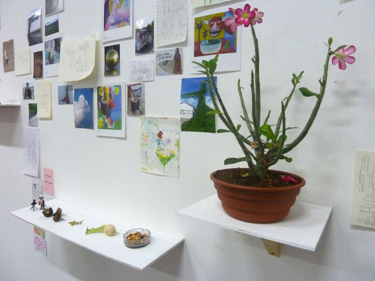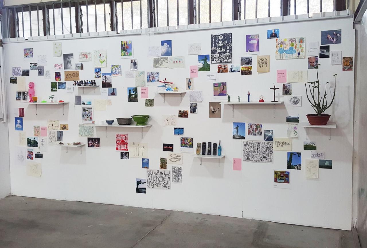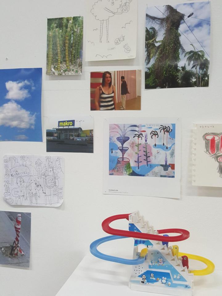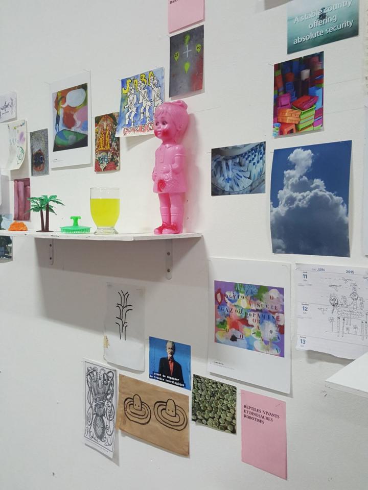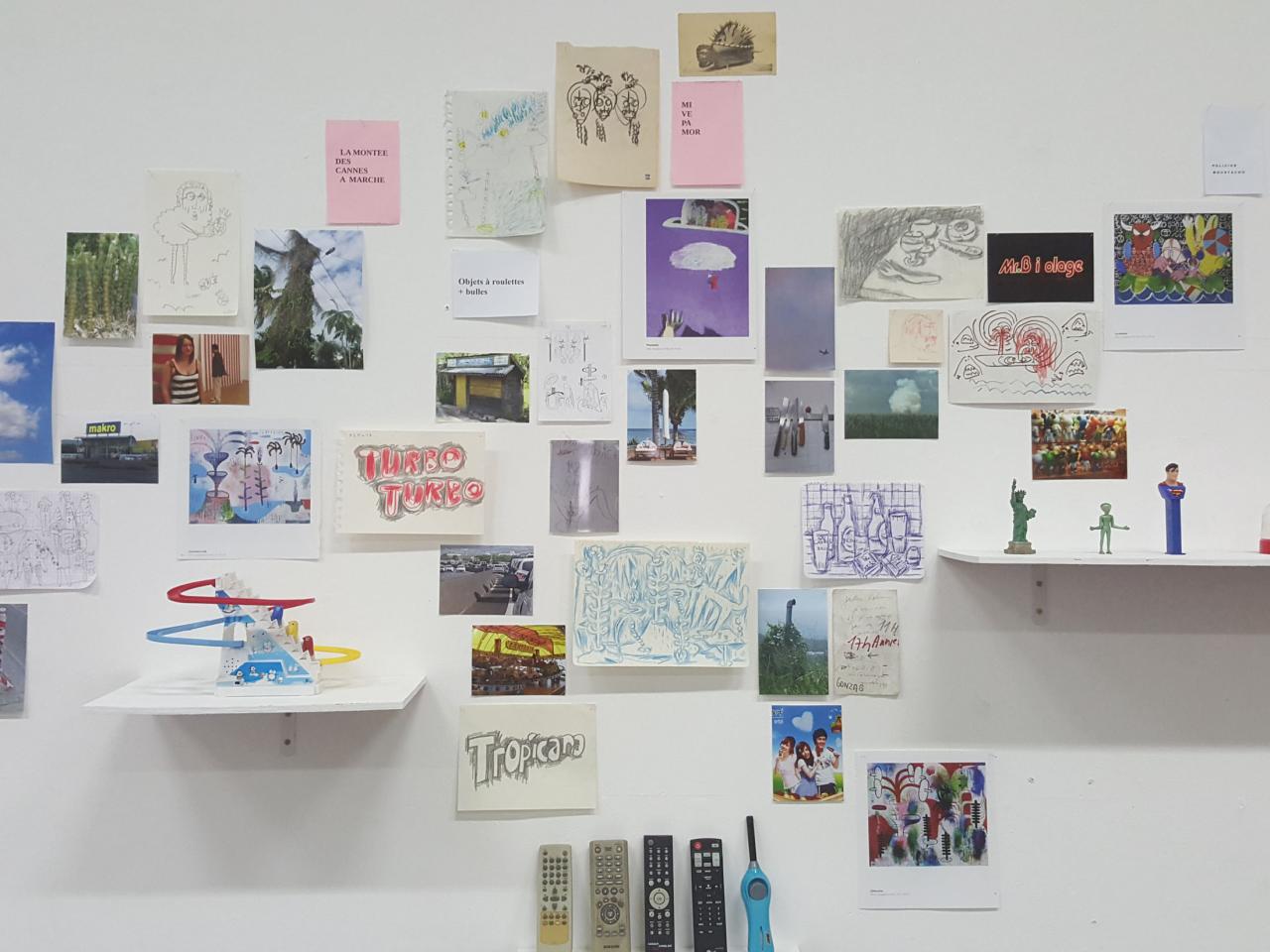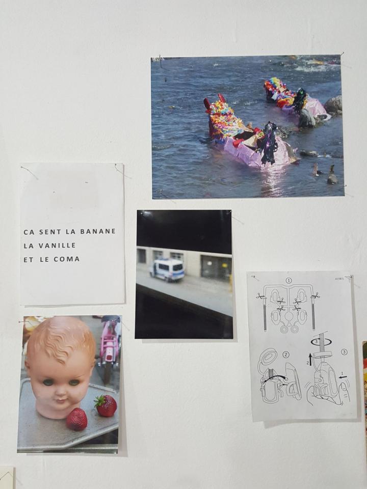 « C’est à une enquête du regard, entre la matérialité concrète de l’œuvre et l’aspect aérien des espaces vides, instables ou indéfinis qu’elle dépeint, que nous convie l’installation Pièces à conviction (2018). Ce dispositif mural se présente comme un espace de recherche de l’ordre de l’atelier, et contient une somme de documents, objets, images et matériaux sources à la fois éparses et ordonnancés. Ceux-ci se font écho, se contredisent ou s’annulent, et le sens se forme de ces points de rencontre ou glisse dans les intervalles. Une pièce qui amorce d’autres pistes d’explorations plastiques pour l’artiste, dans lesquelles couleurs, espaces archipéliques, humour, poésie et références à un inconscient collectif se déploient hors du châssis. »