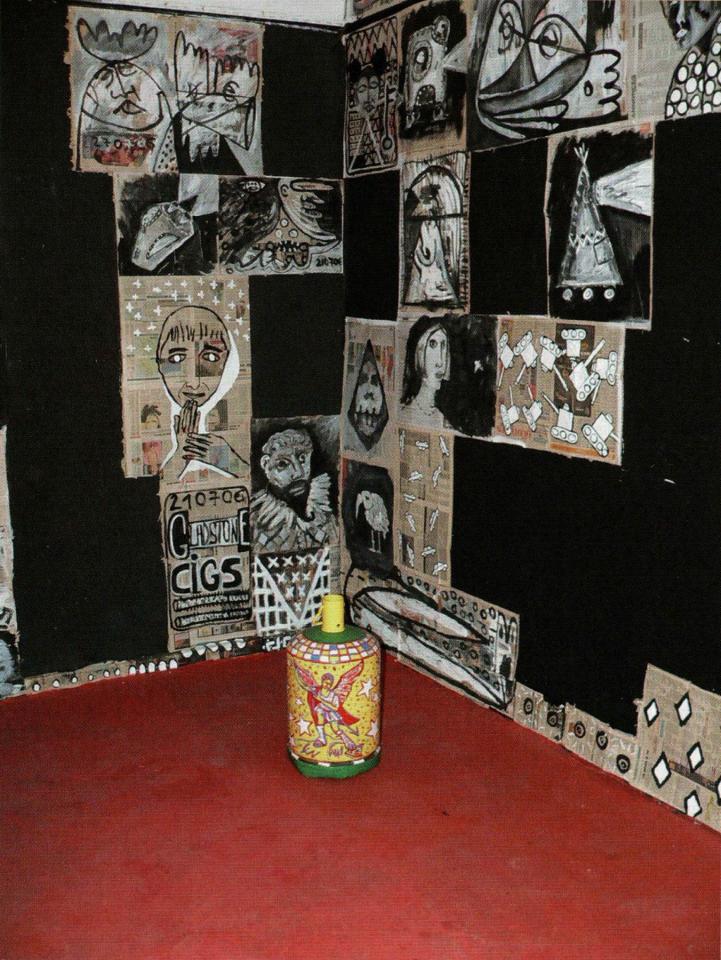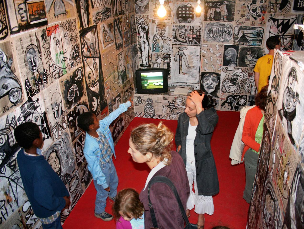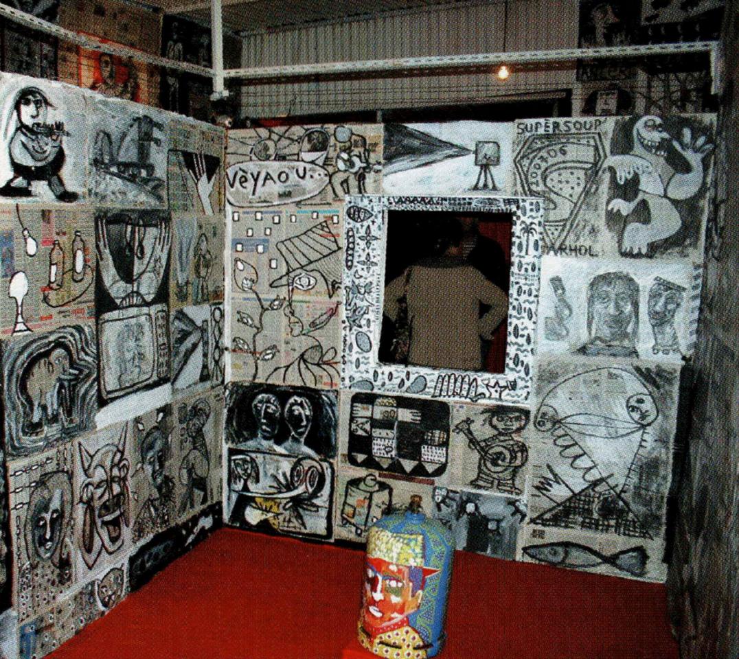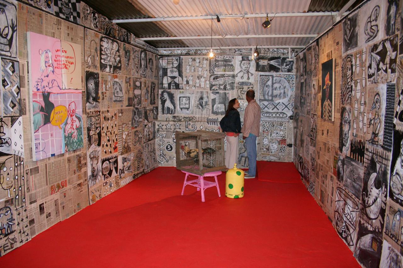 « L’installation Sékans revisite l’intérieur de la kaz kréol traditionnelle : papier journal couverts de dessins en tapisserie, feuilletons à l’eau de rose diffusés en boucle, bouteilles de gaz customisées, kok batay sur un socle rose sorbet, le tout sur un impeccable sol rouge enduit d’encaustique. Une proposition survitaminée où La Réunion d’hier et d’aujourd’hui se juxtaposent effrontément. »