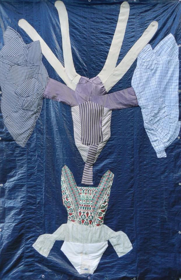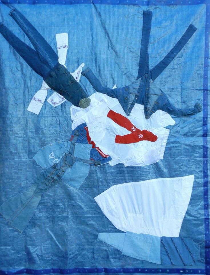 Appliqués sur bâche Pelures - Temps III Ensemble sans titre, 2012Appliqués de vêtements déjà portés, pliés, sur bâches plastiques, environ 300 x 200 cm. Seul, 2012 Encore seul, 2012