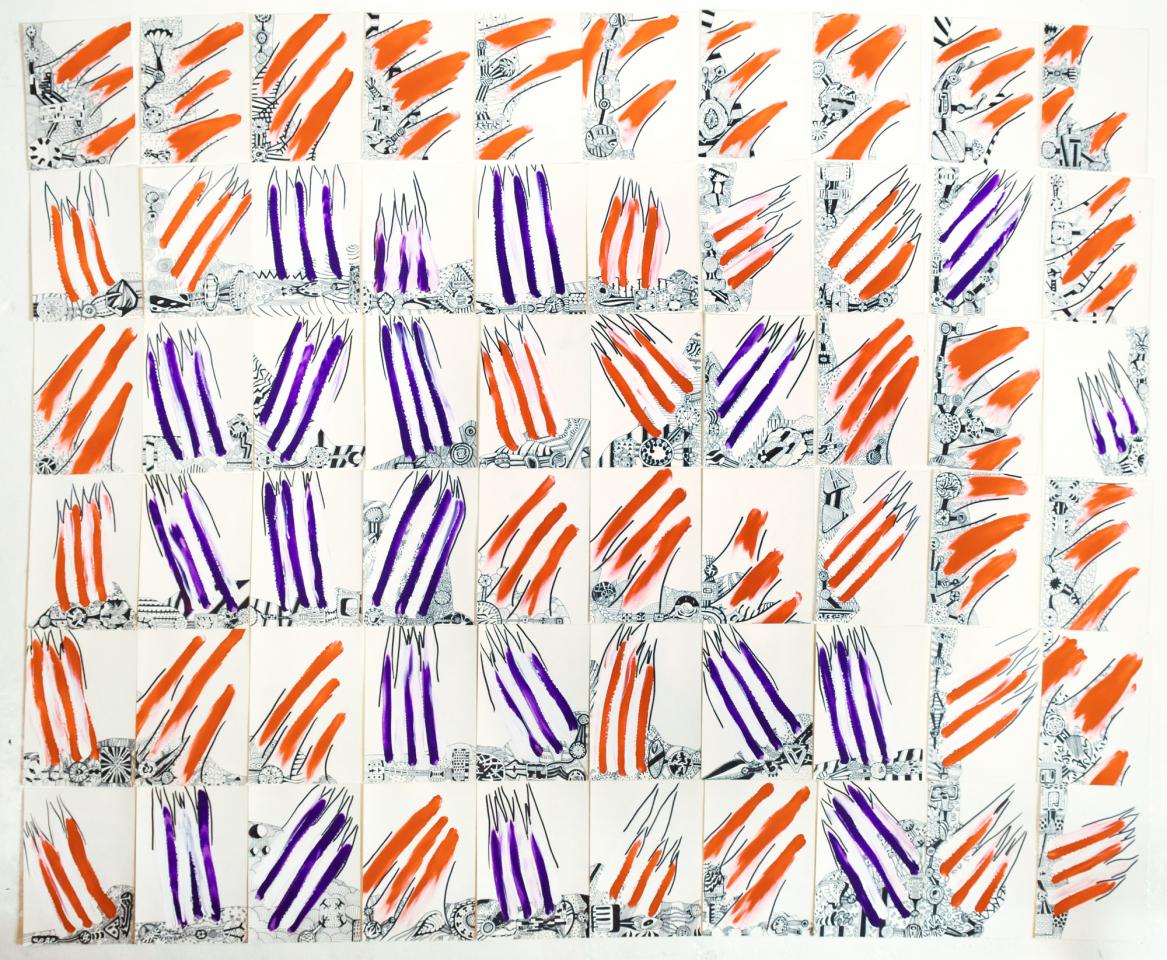 Acrylique sur papier bristol, 60 pièces de 125 x 20 cm.