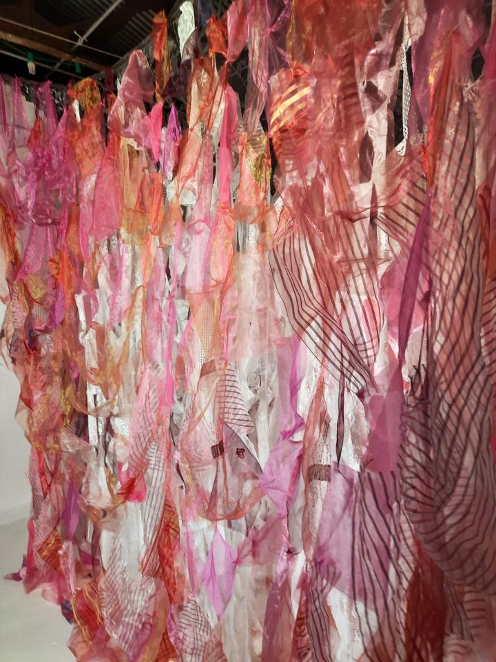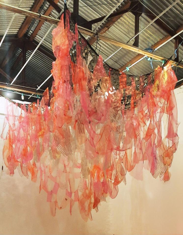 Filet de Faraday Filet de Faraday, 2023 Installation pénétrable, drisse, tissus cousus, suspension, 250 x 350 cm, hauteur 300 cm.Vues d’atelier, LERKA, Saint-Denis, La Réunion