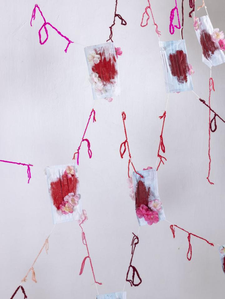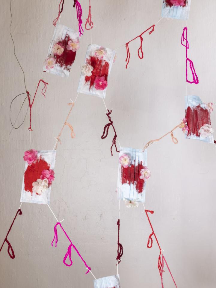 Filet merci Filet merci, 2021Nœuds, coutures, peinture acrylique, masques chirurgicaux, tresses de laine, fleurs en tissu et plastique, dimensions variables, maximum 300 x 150 cm.