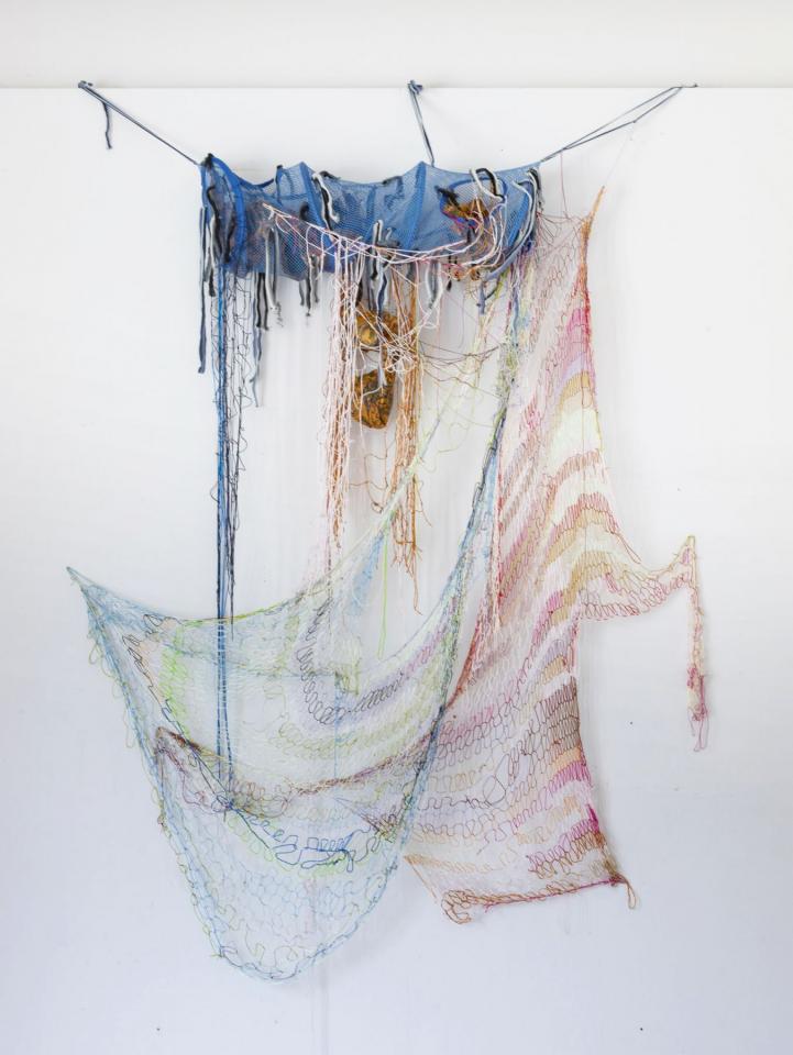 Sculpture textile, suspensions tricots, filets, nœuds, fils synthétiques, nasse pour vêtements, 3 poupées en tissu rembourré, dimensions variables, longueur maximale 235 cm.