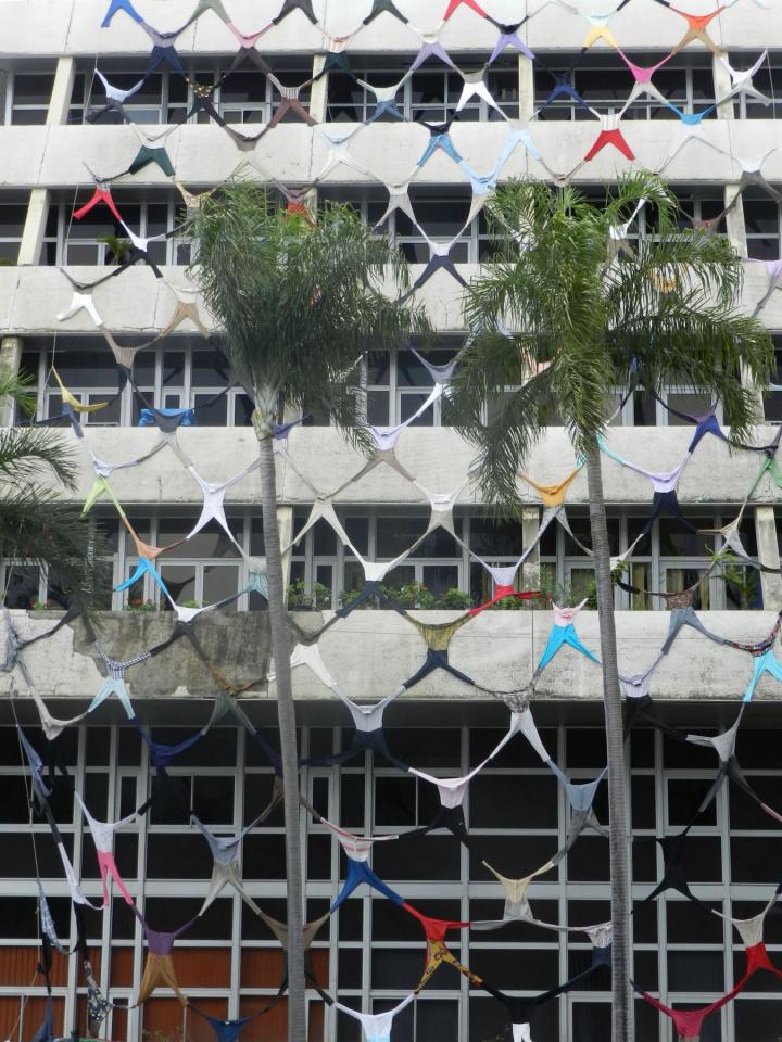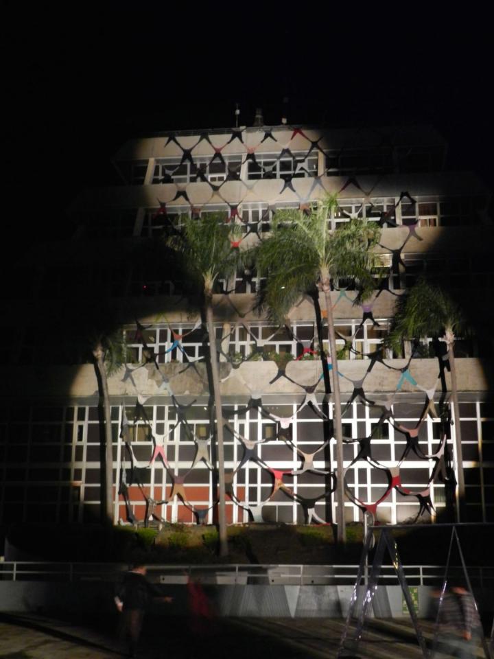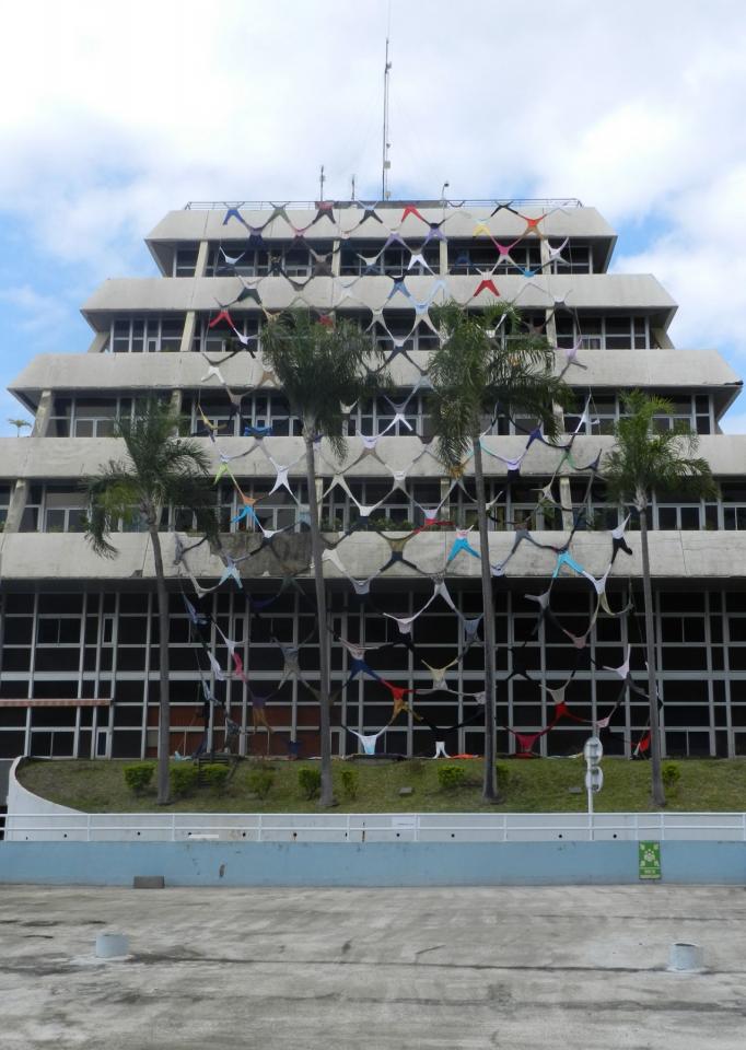 Filet pour une mairie Filet pour une mairie, 2015Installation, vêtements usagés cousus entre eux, cordes, environ 600 m².Journées européennes du patrimoine, mairie de Saint-Denis, La Réunion.Photographies © Antoine Merveilleux du Vignaux