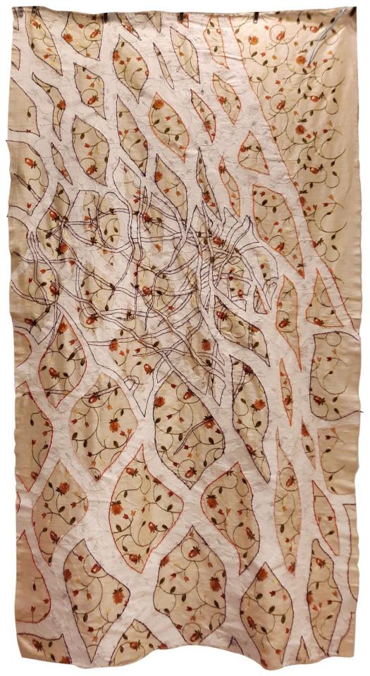 Filet racines, 2023Installation, peinture et broderie sur tissu brodé, 105 x 192 cm.
