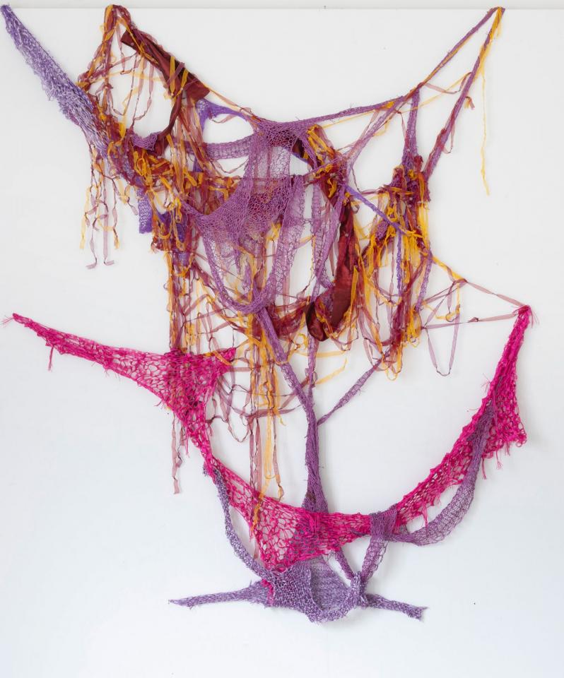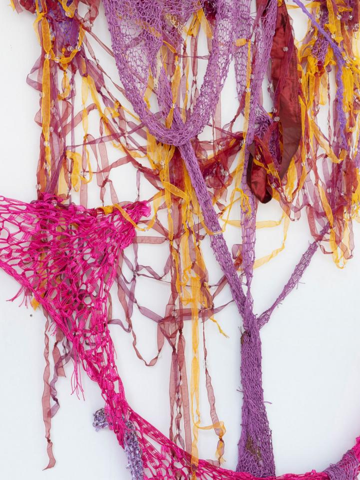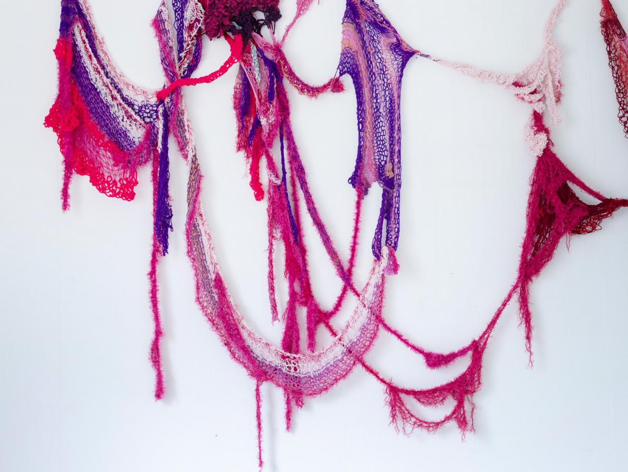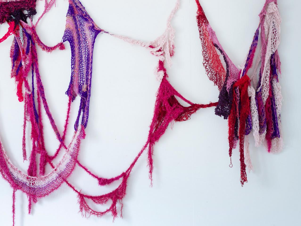 Sculpture textile, tricot de fils synthétiques, laine, rubans de voilage, perles et paillettes, dimensions variables, longueur maximale 330 cm.