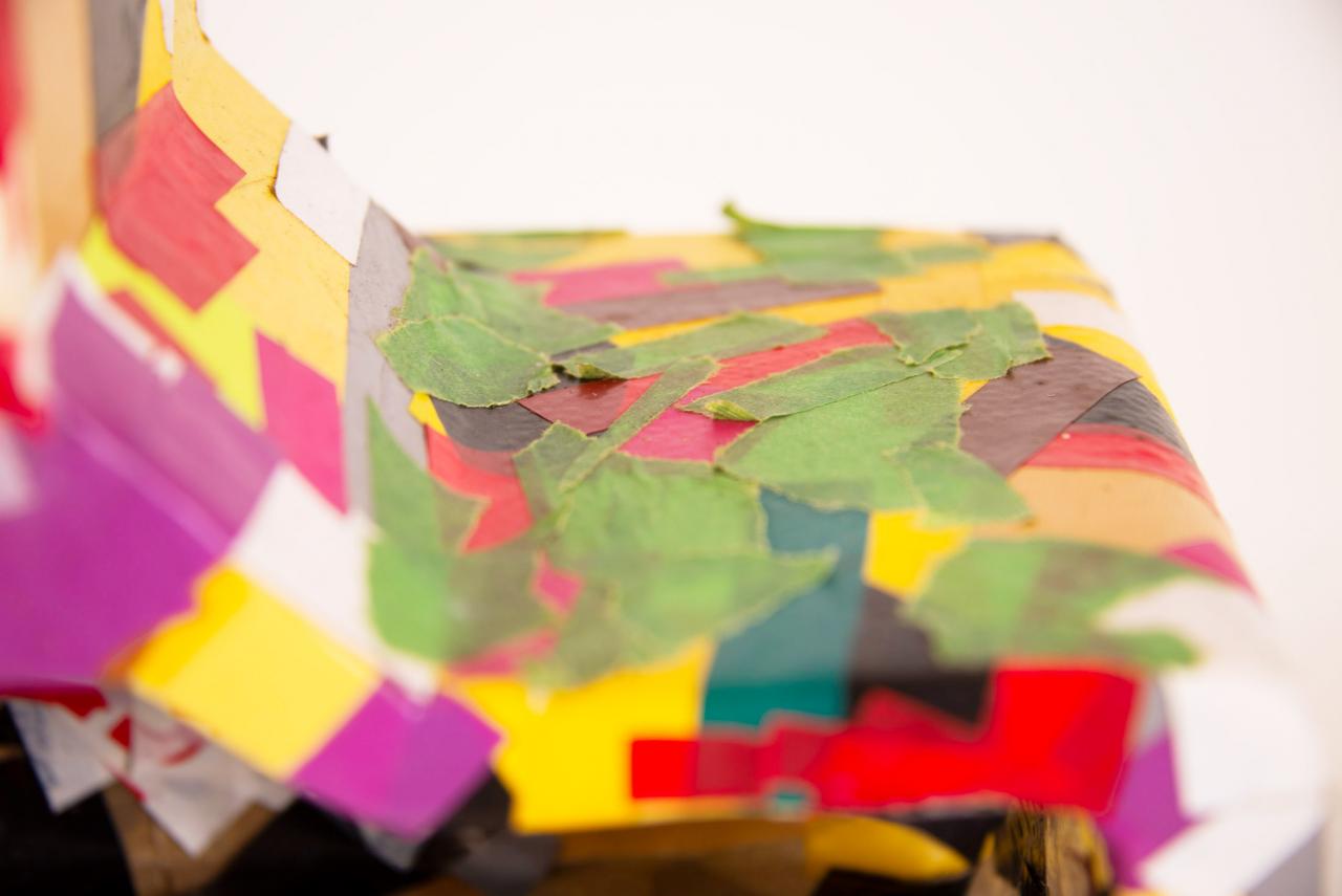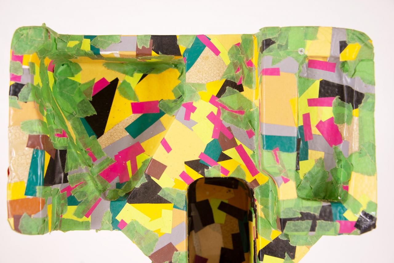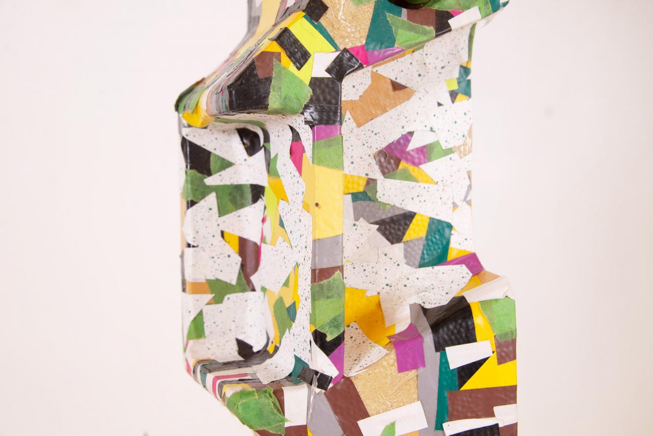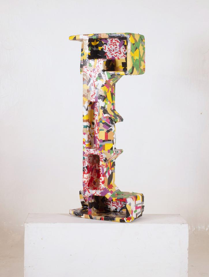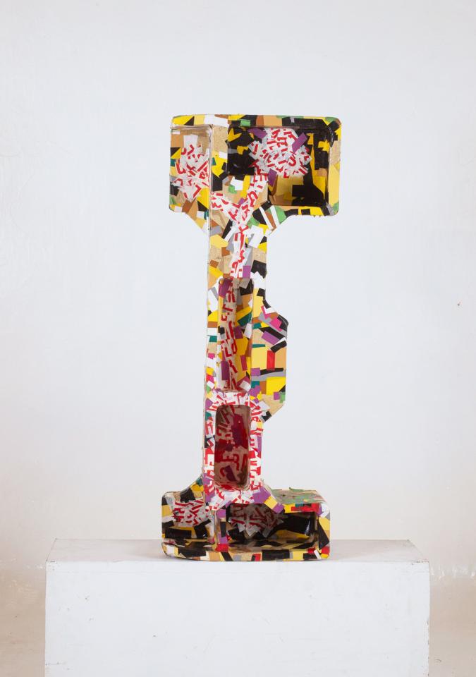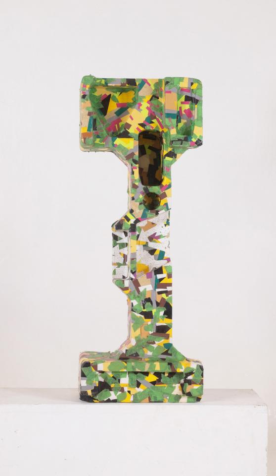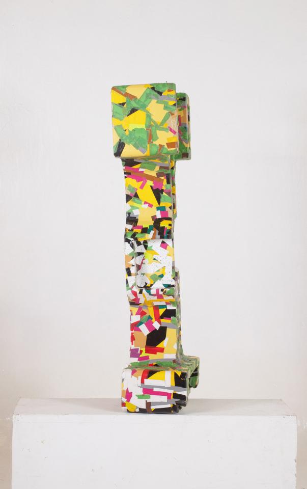 Ligne Rouge inspiré V Sans titre, 2013-2014Ruban adhésif sur calage d’électroménager en polystyrène, 81 x 39 x 16 cm.