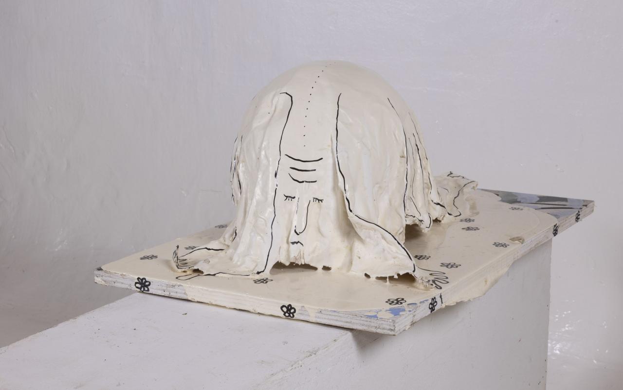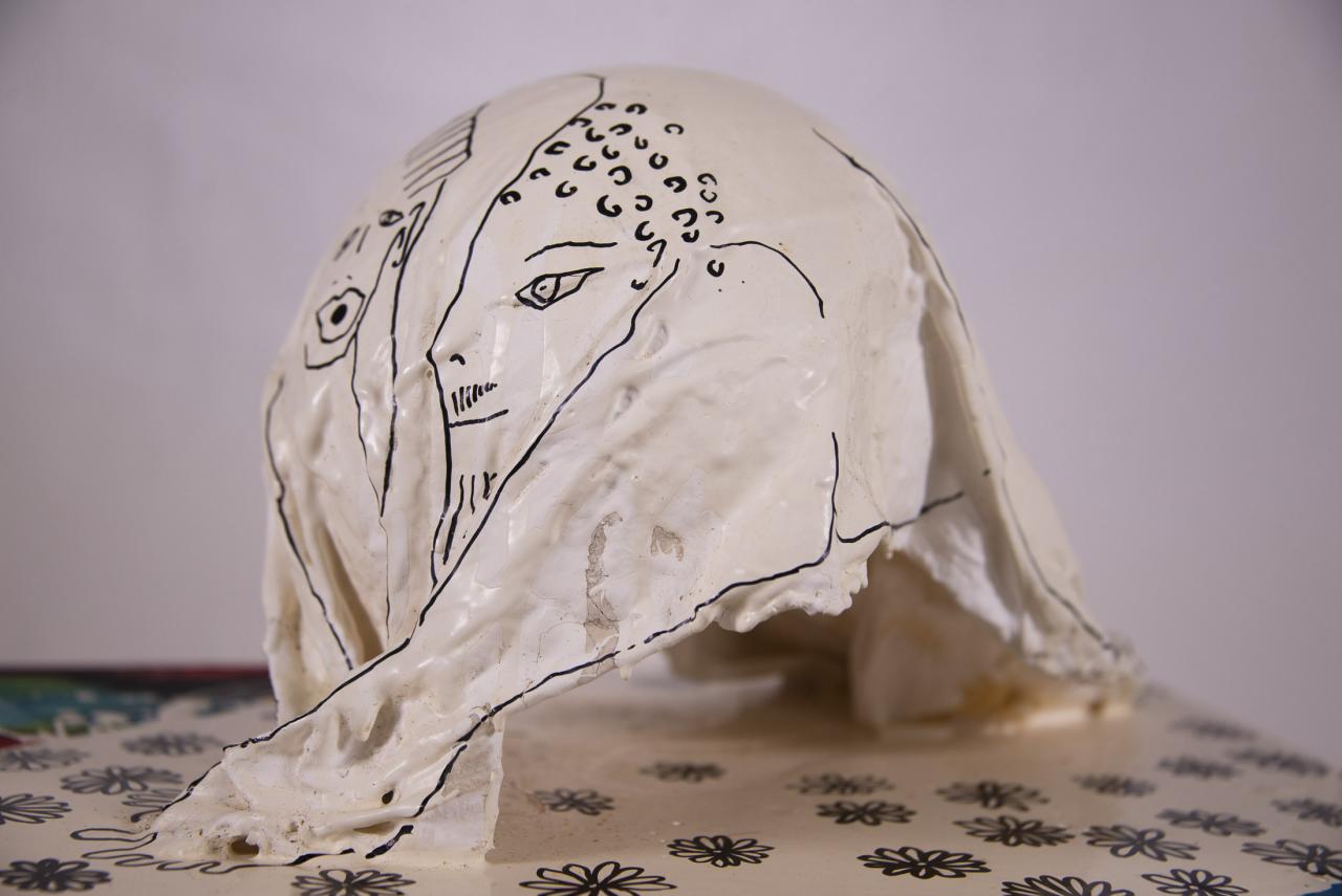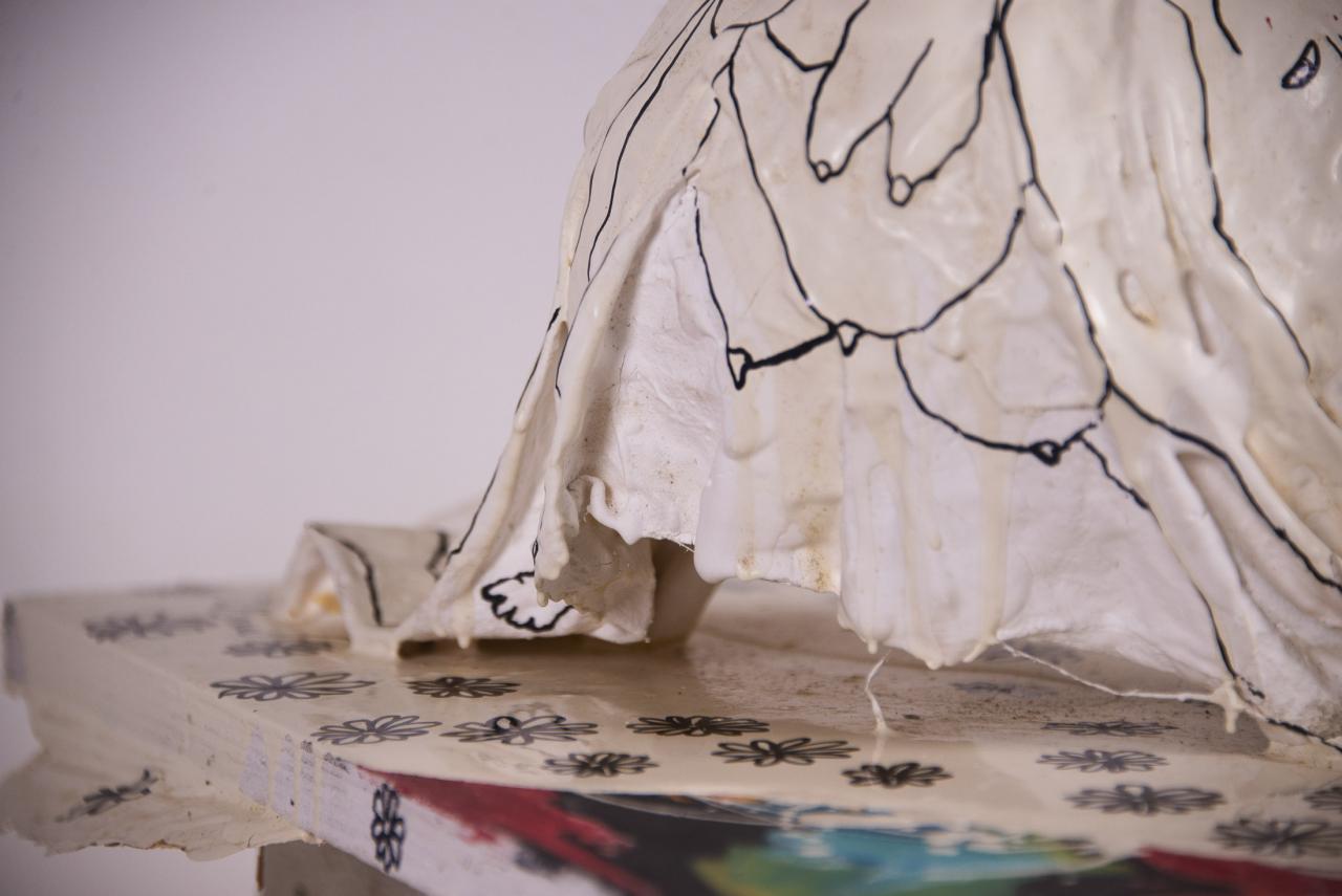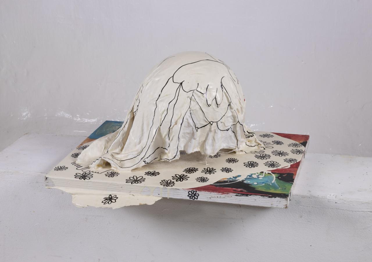 Peinture acrylique, peinture vernissée, stylo feutre, colle sur tissu imprégné et formé, bois.